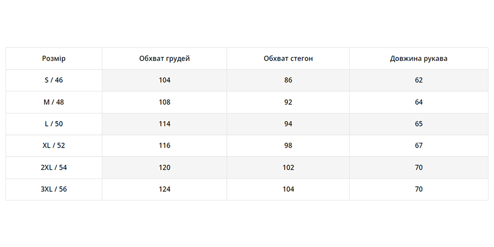 | Розмір | S, M, L, XL, XXL, 3XL |