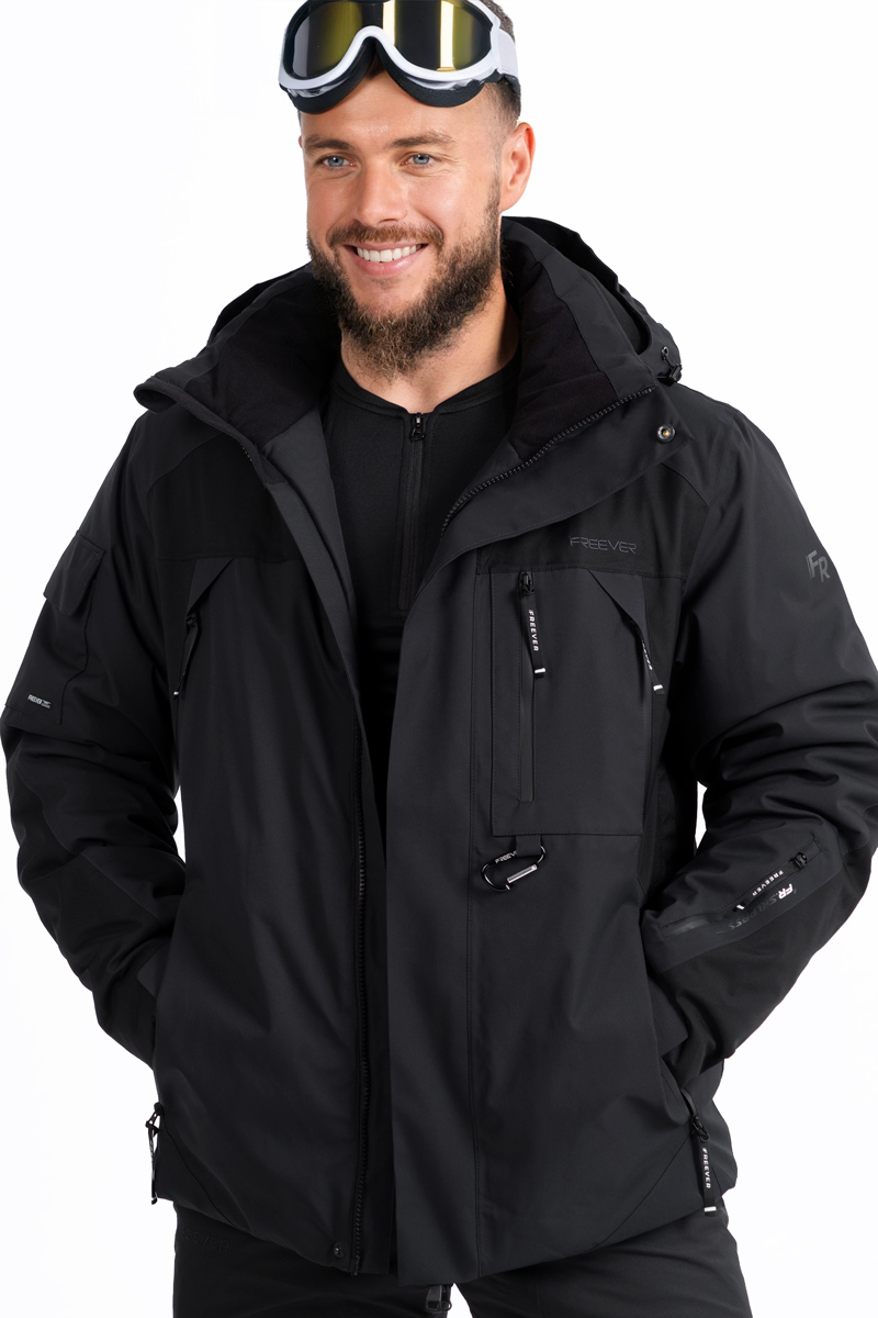 Чоловіча гірськолижна куртка Freever NF 21639 чорна – преміальна модель для екстремальних умов та активного відпочинку. Сучасний матеріал 4-WAY SYSTEM з мембраною (15 000 мм водонепроникності та 15 000 г/м²/24 год паропроникності) надійно захищає від вітру та вологи, зберігаючи при цьому відмінну повітропроникність. Утеплювач щільністю 120 г/м² та підкладка TERMO SYSTEM забезпечують ідеальний баланс тепла та комфорту.