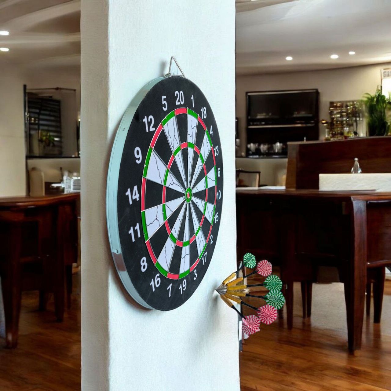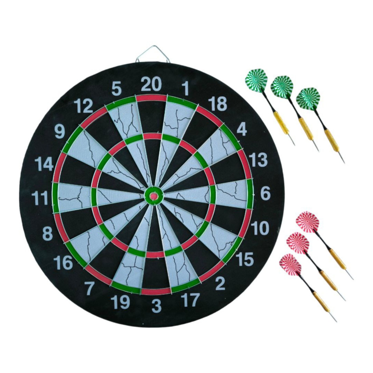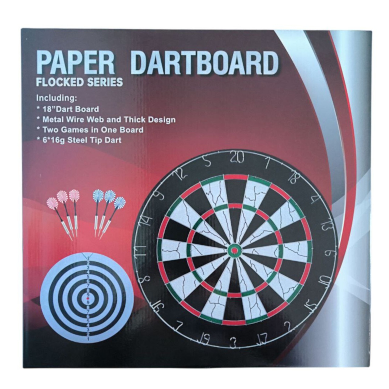 Набір для гри в дартс FLOCKED SERIES 18+ складається з мішені 18 дюймів та 6 дротиків з червоним та зеленим оперенням. Мішень виготовлена з пресованого картону та покрита спеціальним матеріалом флок, який створює бархатисту поверхню. Флокове покриття допомагає продовжити термін служби мішені, запобігаючи швидкому зносу. Такі мішені часто є доступнішими за ціною, ніж мішені із сизалю. Цифри на поверхню мішені завдані накатом. Сектор мішені розділені металевим дротом. Цей набір ідеально підходить для розважальної гри в дартс у колі друзів.