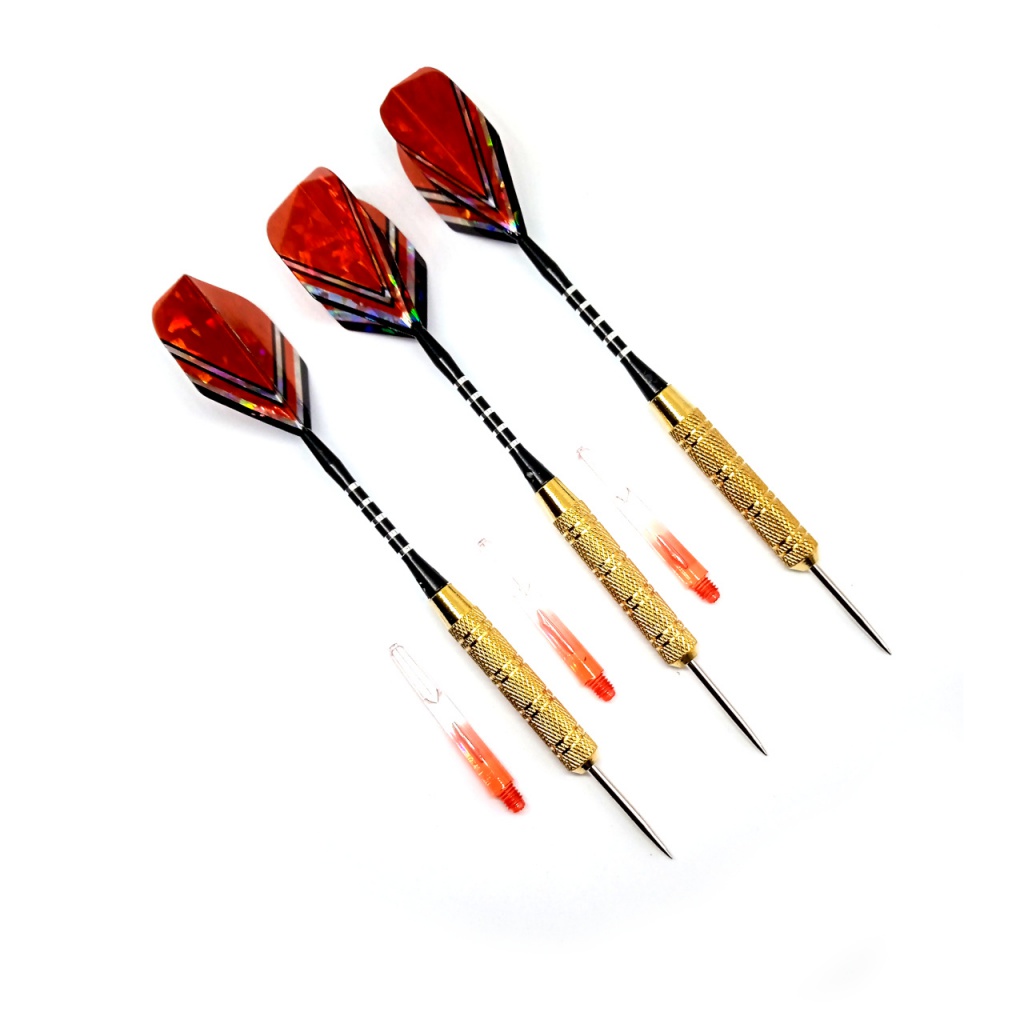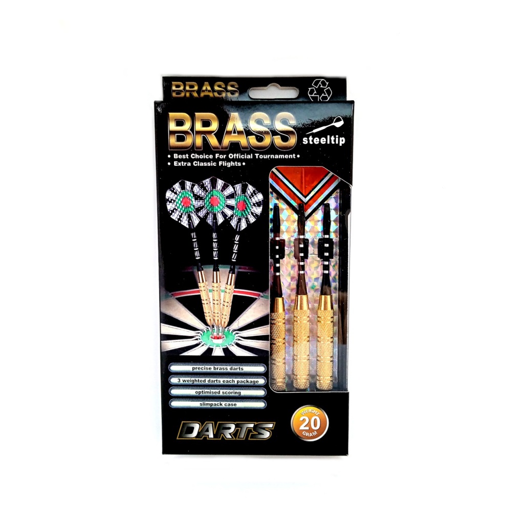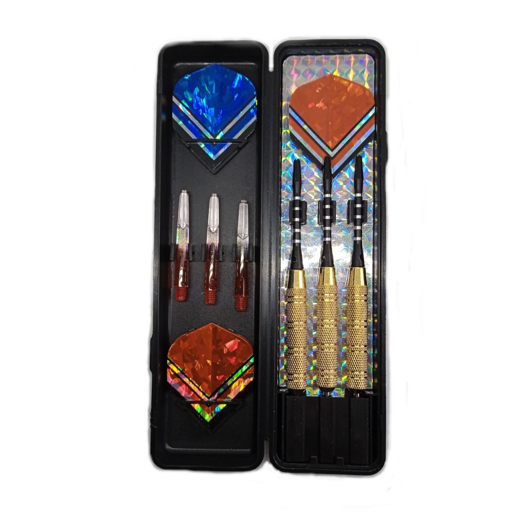 Набір з 3 дротиків вагою 21 грам для гри в дартс. Дротики для дартса мають гострі металеві наконечники та ергономічні утримувачі. Барель виготовлений з латуні, наконечник – сталь, хвостовик – нейлон, а оперення – пластик. Для зручності зберігання до комплекту входить пластиковий футляр.