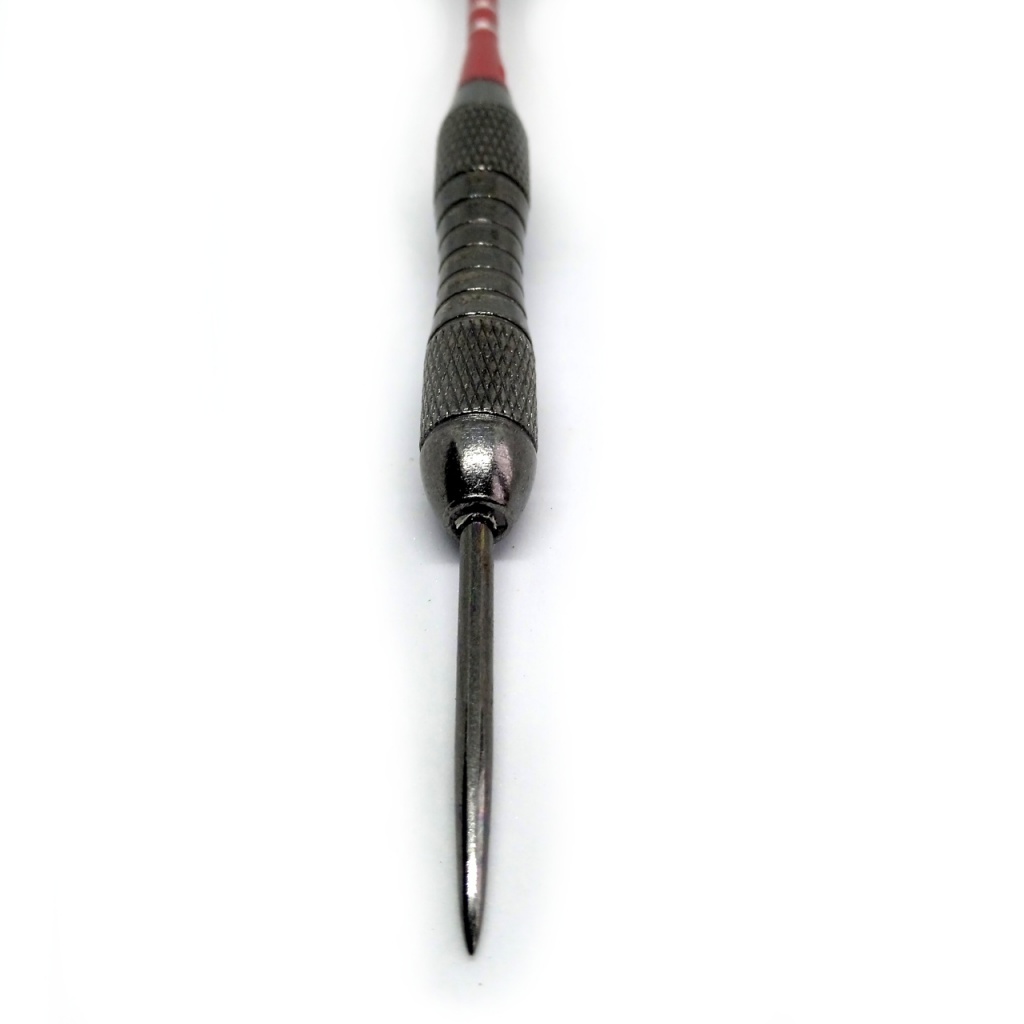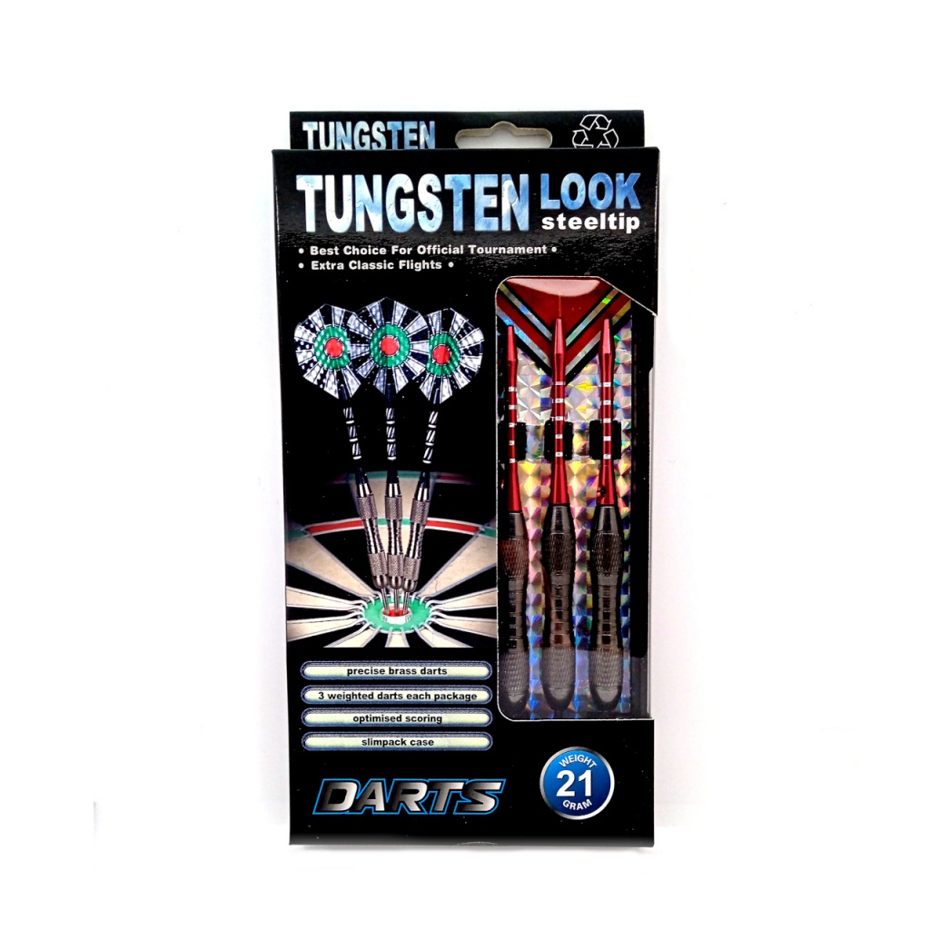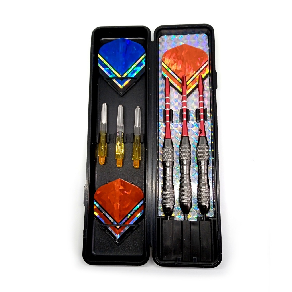 Набір з 3 дротиків вагою 21 грам для гри в дартс. Дротики для дартса мають гострі металеві наконечники та ергономічні утримувачі. Барель виготовлений з латуні, наконечник – сталь, хвостовик – нейлон, а оперення – пластик. Дана модель дротиків має можливість зміни ваги, за рахунок зміни утримувача пера. Для зручності зберігання до комплекту входить пластиковий футляр.