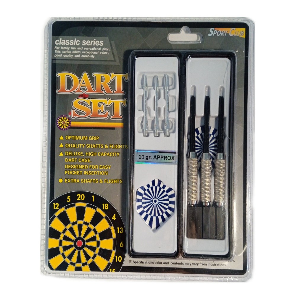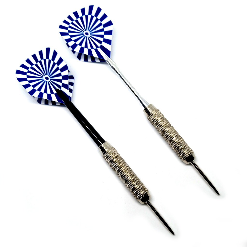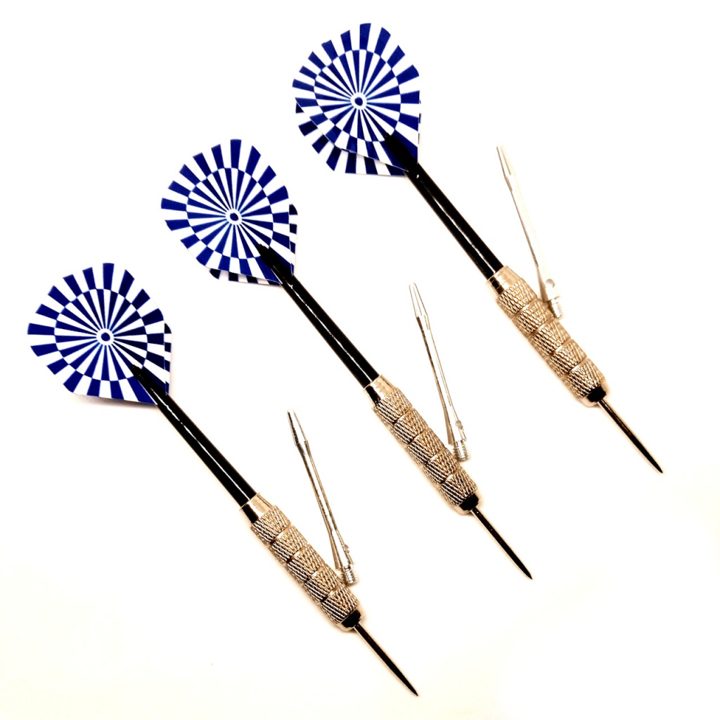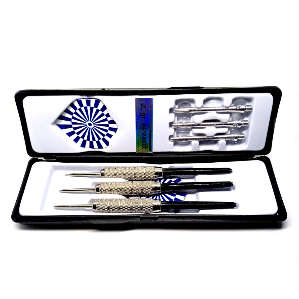 Набір з 3 дротиків вагою 24 грам для гри в дартс. Дротики для дартса мають гострі металеві наконечники та ергономічні утримувачі. Барель виготовлений з латуні, наконечник – сталь, хвостовик – нейлон, а оперення – пластик. Дротики мають можливість зміни ваги за рахунок зміни тримача піра. Для зручності зберігання до комплекту входить пластиковий футляр.