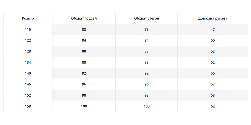 | Розмір | 116, 122, 128, 134, 140, 146, 152, 158 |