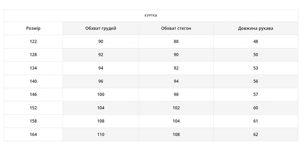 | Розмір | 122, 128, 134, 140, 146, 152, 158, 164 |