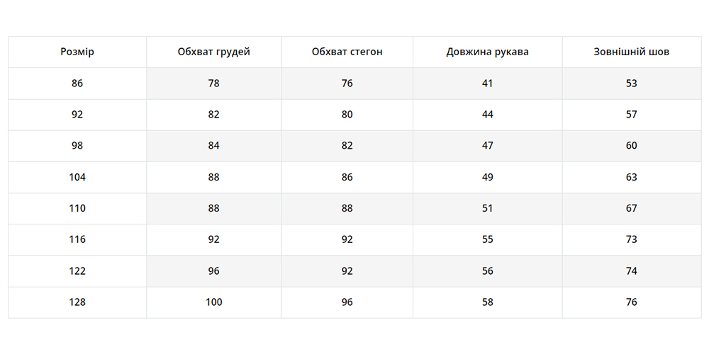 | Розмір | 86, 92, 98, 104, 110, 116, 122, 128 |