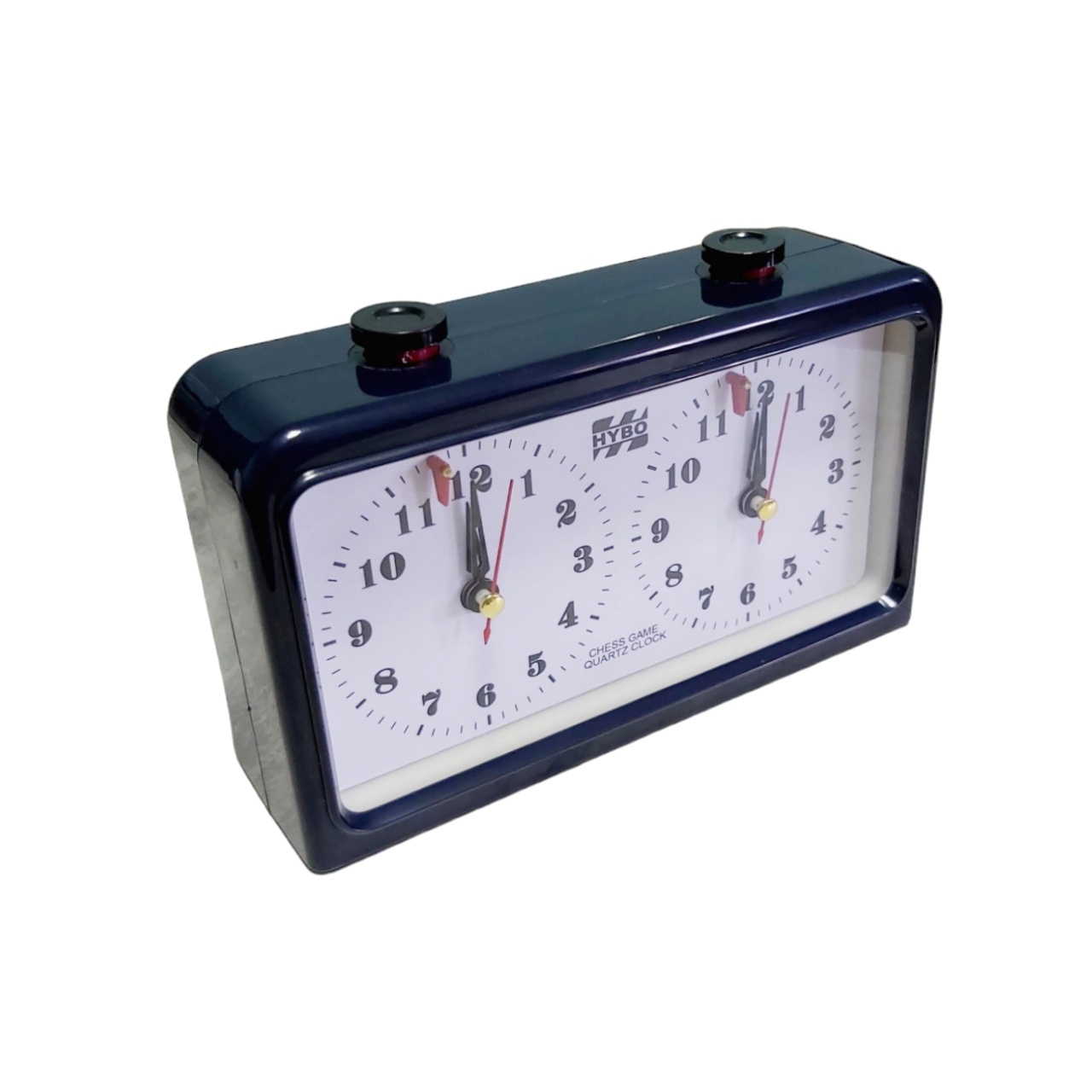 Кварцовий шаховий годинник використовується для контролю часу під час гри. За зовнішнім виглядом та функціональністю вони не відрізняються від механічних годинників. Мають два розділені циферблати та кнопки. На кожному циферблаті є прапорець фіксації закінчення часу. З зворотного боку знаходяться два поворотні механізми переведення стрілок для регулювання годинної та хвилинної стрілки. Працюють від однієї батареї ААА, яка не входить у комплект.