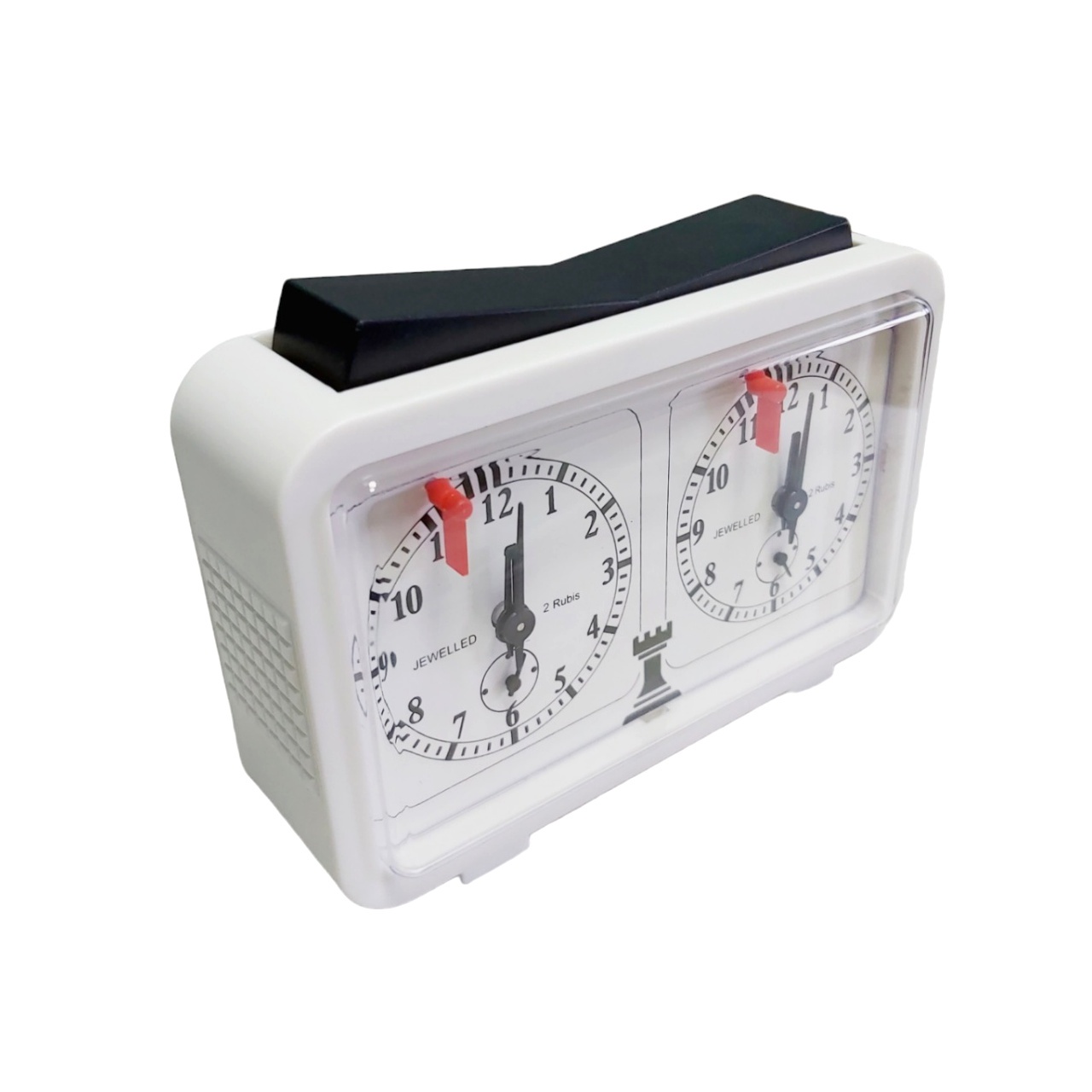 Кварцовий шаховий годинник використовується для контролю часу під час гри. За зовнішнім виглядом та функціональністю вони не відрізняються від механічних годинників. Мають два розділені циферблати та кнопки. На кожному циферблаті є прапорець фіксації закінчення часу. З зворотного боку знаходяться два поворотні механізми переведення стрілок для регулювання годинної та хвилинної стрілки.