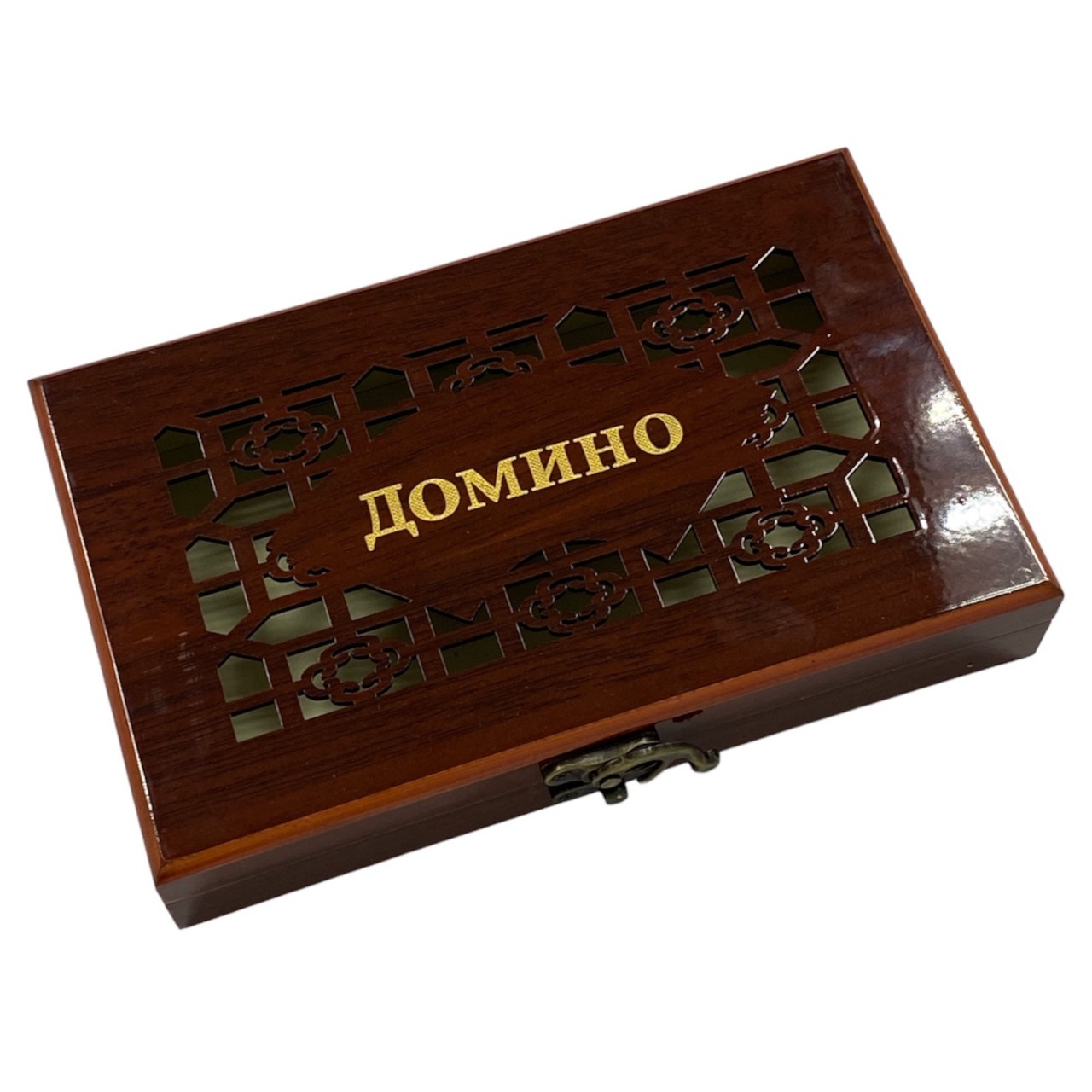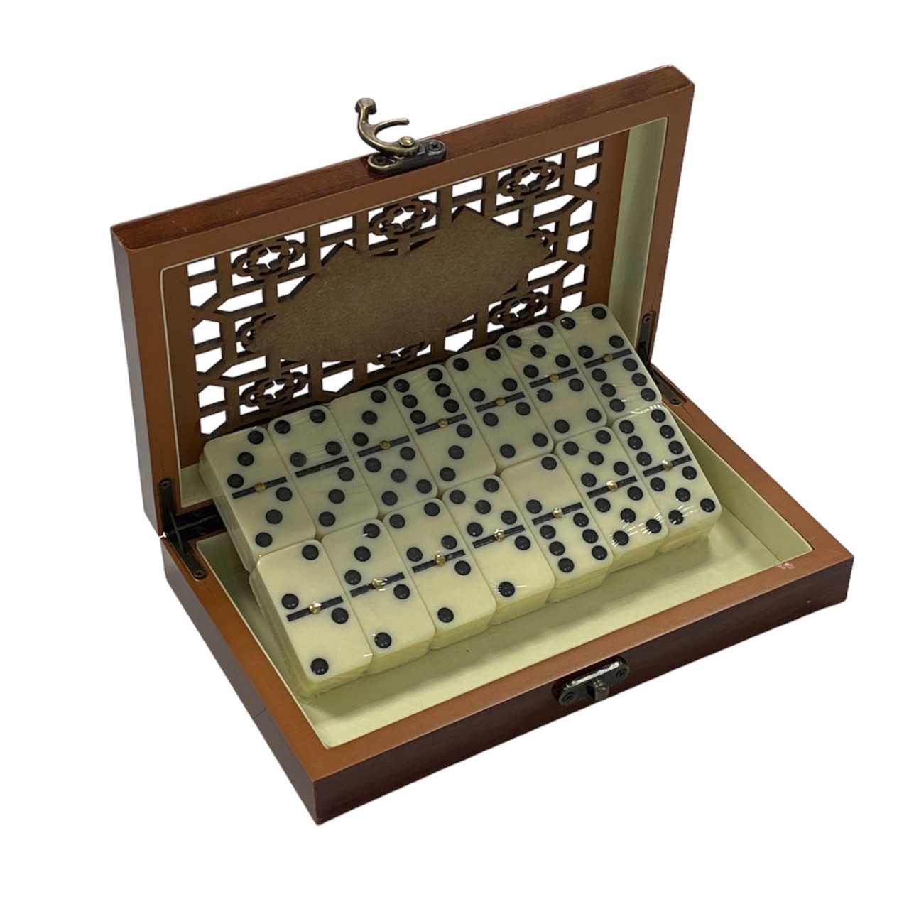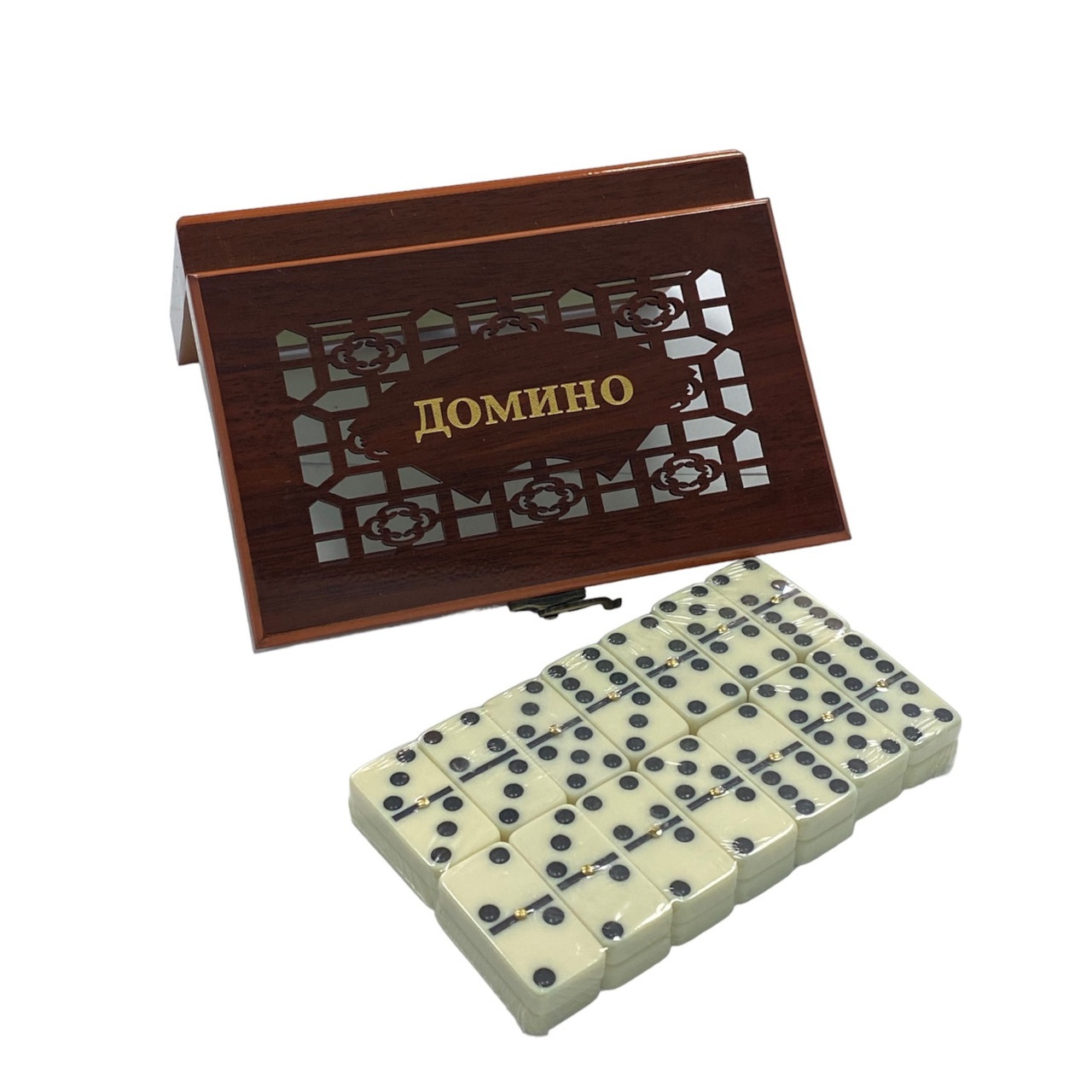 Доміно класичне виготовлене з міцного пластику з імітацією кольору слонової кістки. Подарунковий футляр для зберігання кісточок виконаний з візерунком на лицьовій частині та сувенірним замочком. Таку компактну скриньку завжди приємно взяти до рук.
