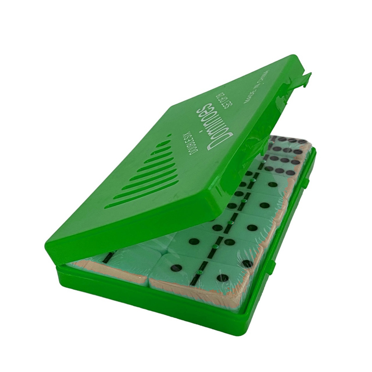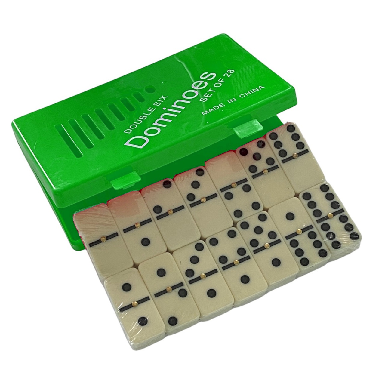 Доміно класичне виготовлене з міцного пластику з імітацією кольору слонової кістки. Футляр для зберігання кісточок виконаний із кольорового пластику.