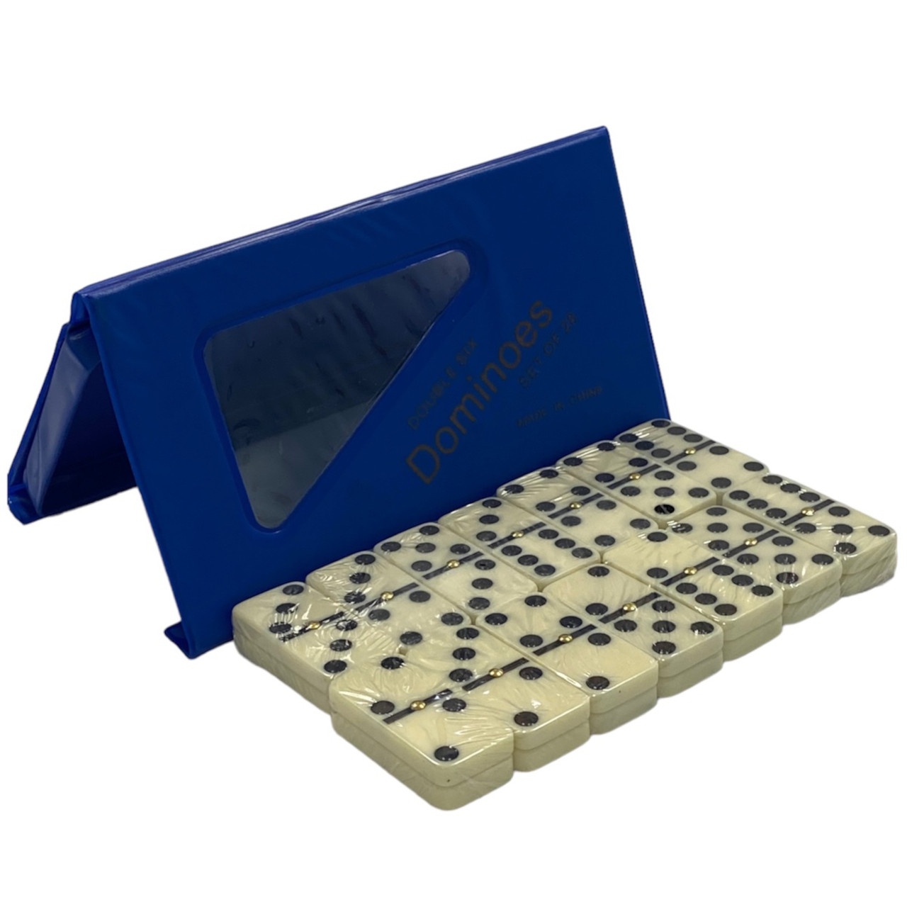 Доміно класичне виготовлене з міцного пластику з імітацією кольору слонової кістки. Футляр для зберігання кісточок виконаний із кольорового м’якого ПВХ.