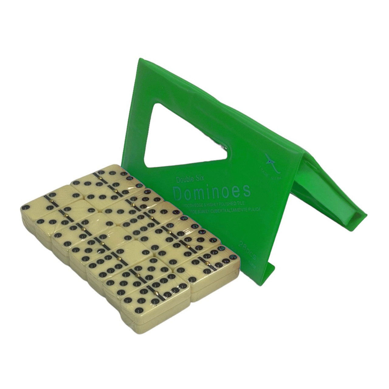 Доміно класичне виготовлене з міцного пластику з імітацією кольору слонової кістки. Футляр для зберігання кісточок виконаний із кольорового м’якого ПВХ.
