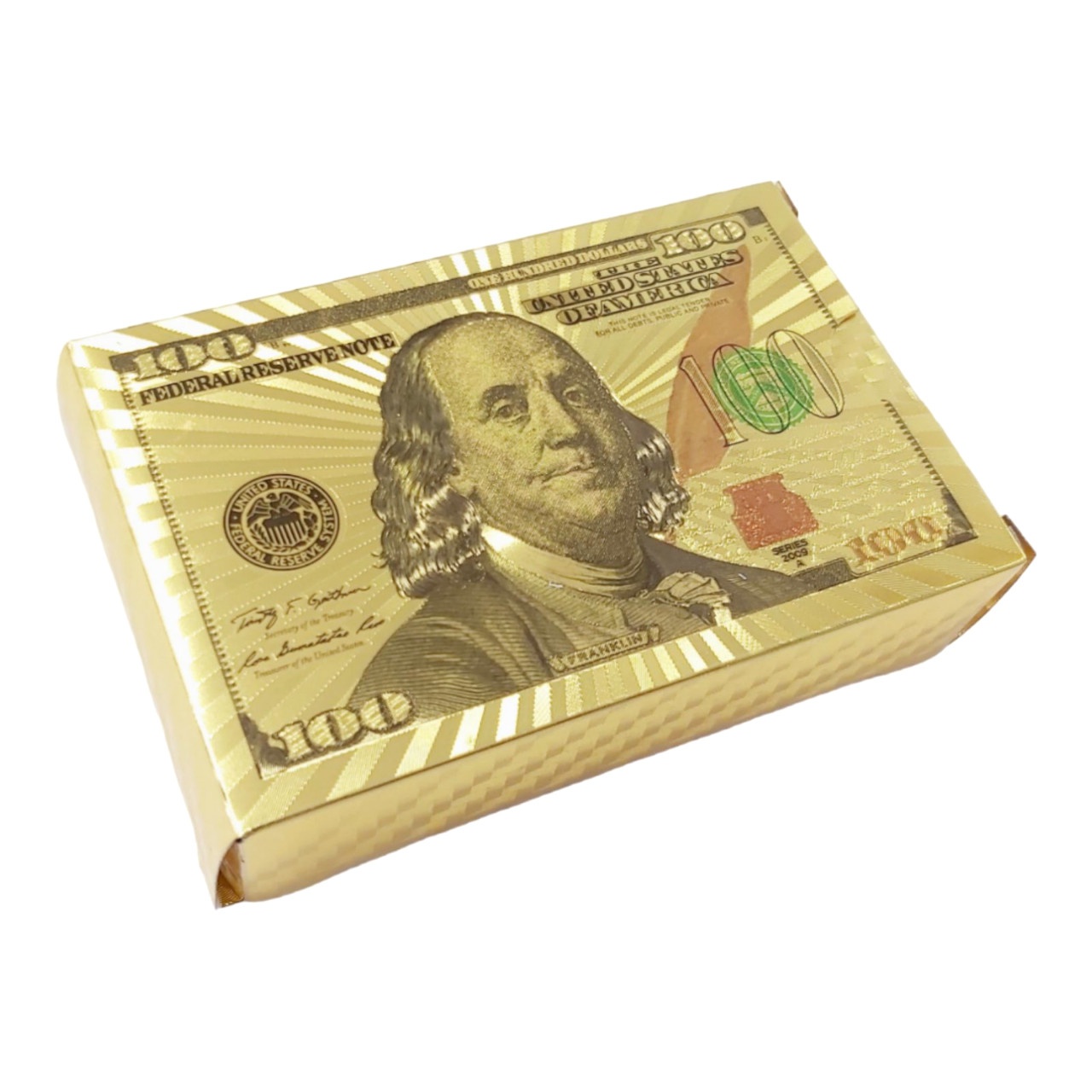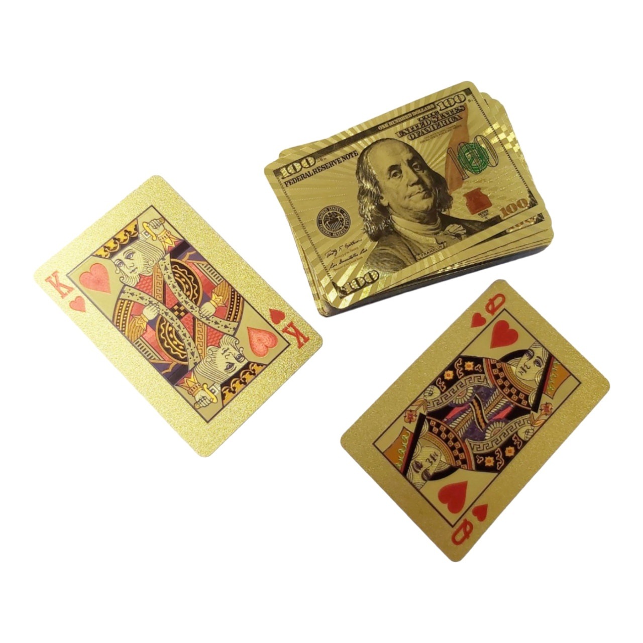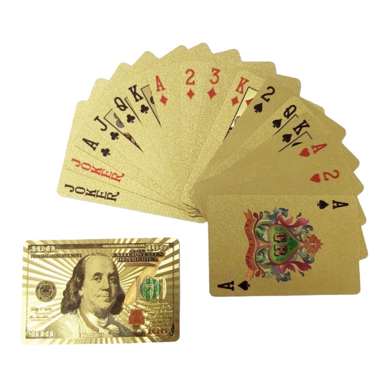 Карти для гри в покер виготовлені із щільного пластику імітованого “під золото”. Колода налічує 54 карти, які упаковані у коробочку.