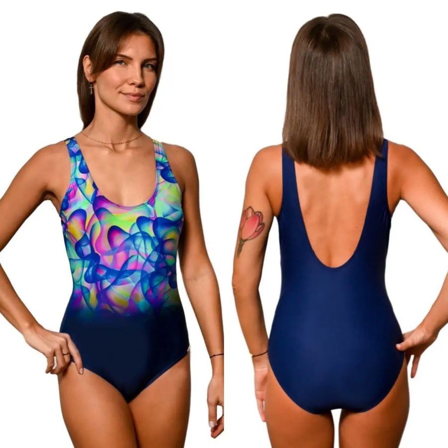 Круглий виріз на грудях і широкі бретелі сприяють рівномірному розподілу тиску на плечі, запобігаючи втомі або дискомфорту. Напіввідкрита спинка додає елегантності і в той же час дозволяє дихати шкірі, гарантуючи додатковий комфорт при тривалих тренуваннях. Важлива особливість моделі – непрозора тканина, що надає впевненості при плаванні та гарантує, що купальник не просвічується навіть у змоклому стані.