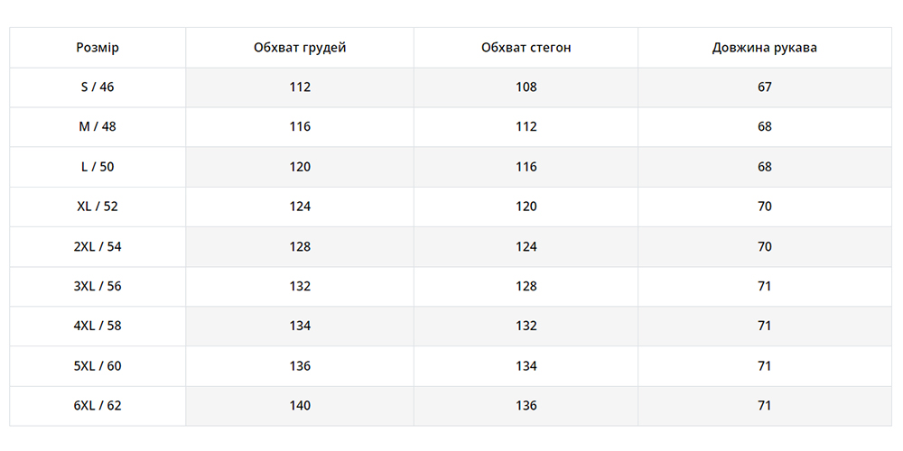 | Розмір | 46, 48, 50, 52, 54, 56, 58 |