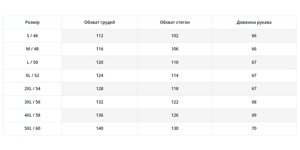 | Розмір | 46, 48, 50, 52, 54, 56, 58, 60 |