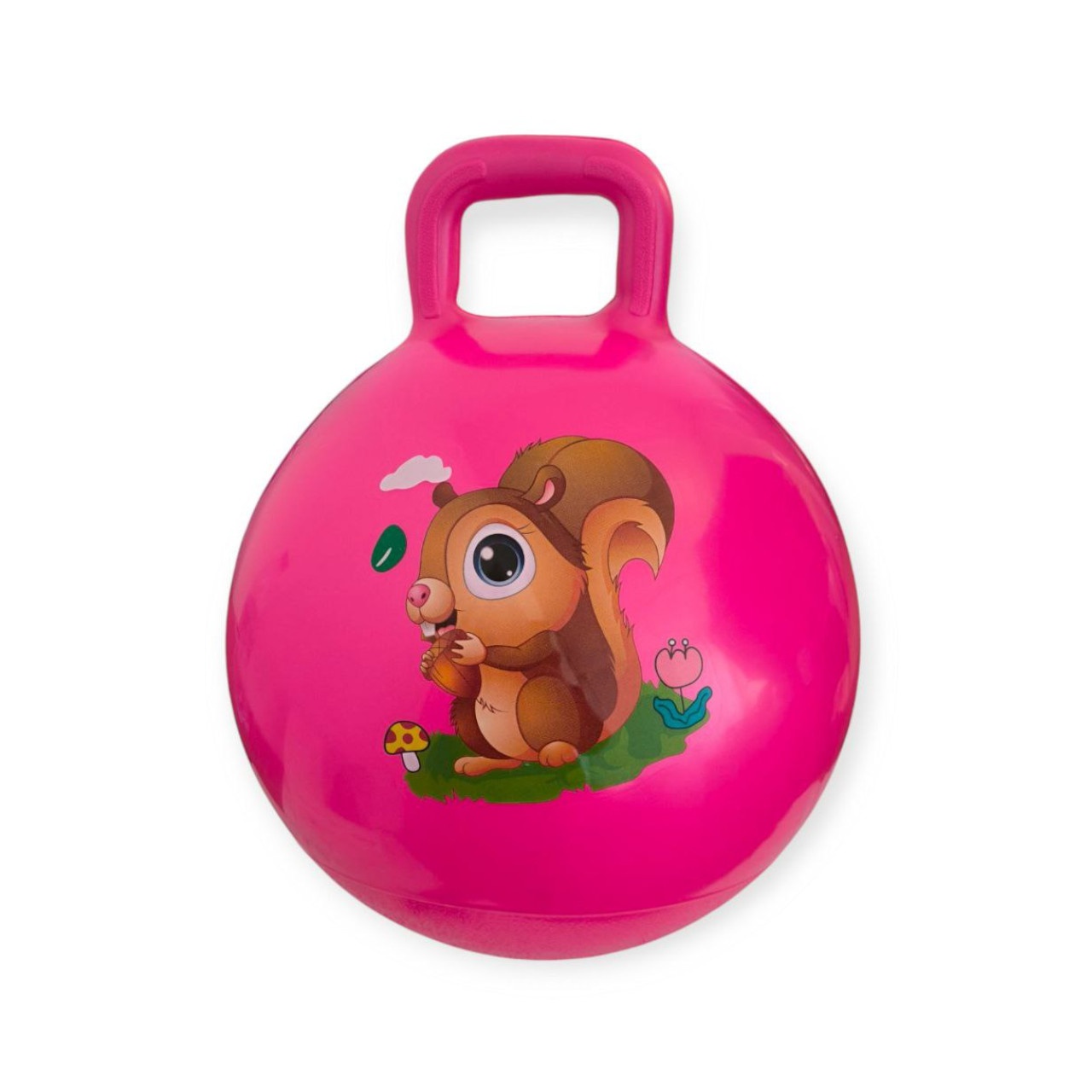 **М’яч дитячий стрибун (з ручкою, рожевий)** — це надувний м’яч-стрибун, також відомий як поп-м’яч або кенгуру, виготовлений з міцного ПВХ. Модель має ручку зверху, яка дозволяє дитині триматися під час стрибків, забезпечуючи безпеку та контроль.
