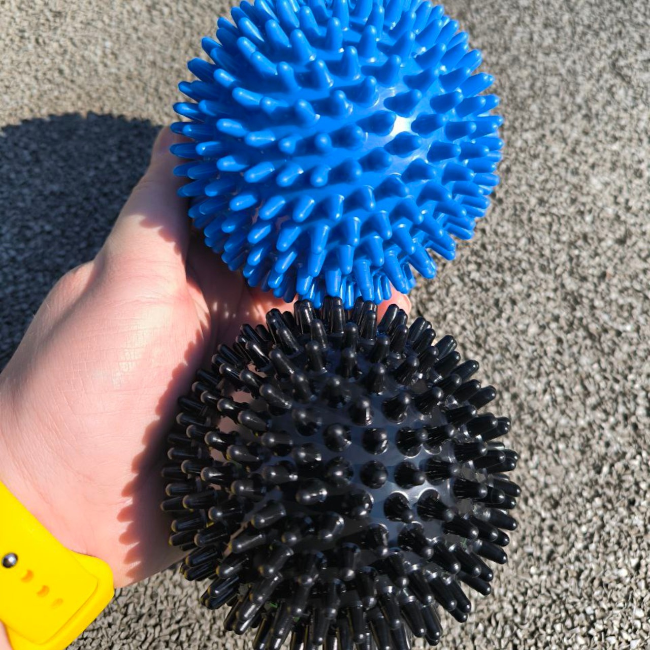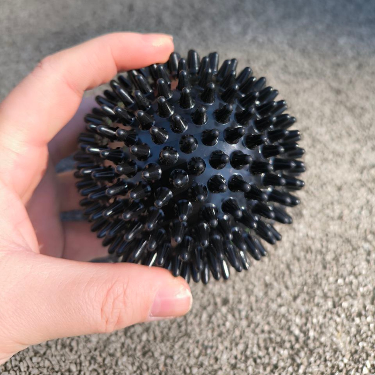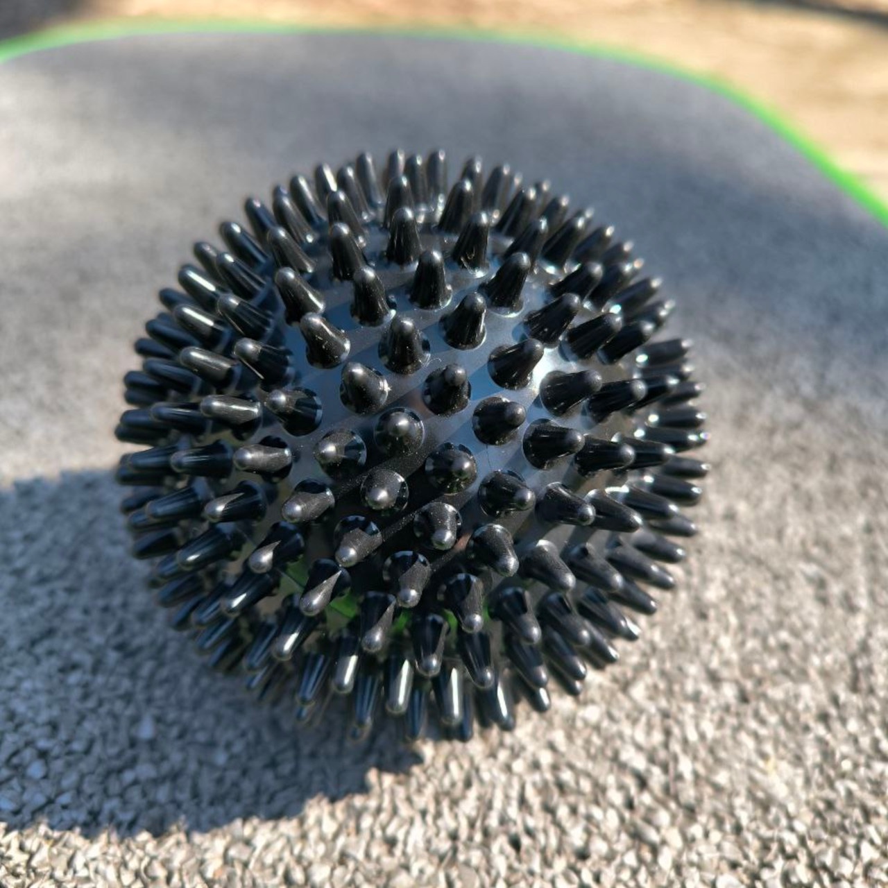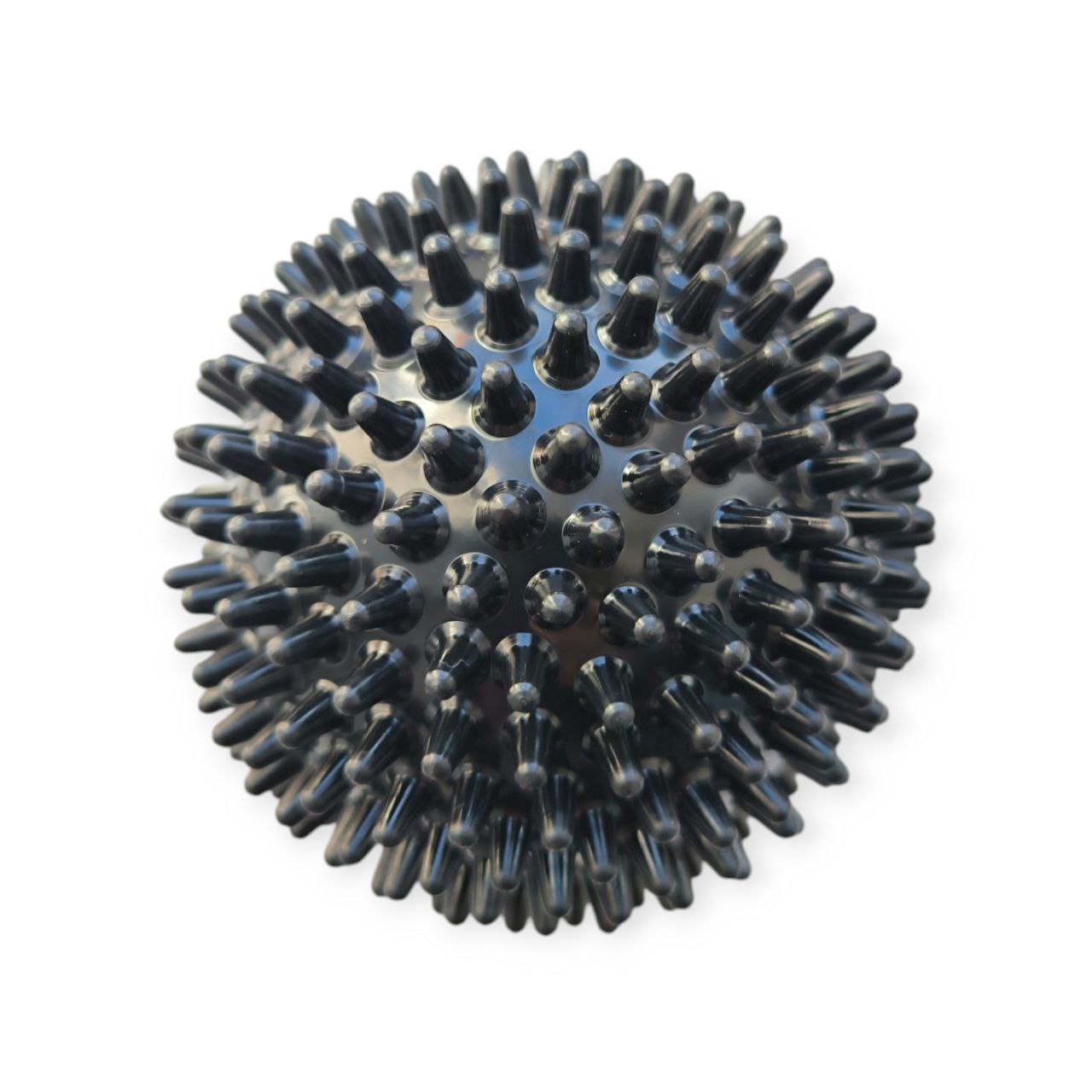 М’яч масажний виготовлений з ПВХ. Конструкцією м’яча не передбачений ніпель, тому відсутня можливість його накачати. За рахунок його помірній жорсткості можливо ефективно впливати на м’язи та фасції, не викликаючи надмірного дискомфорту. Даний м’ячик є чудовим інструментом для самомасажу та міофасціального розслаблення.