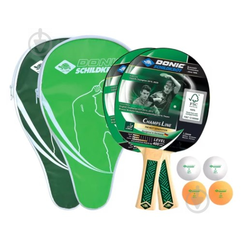 Новий набір Champs 400 від Donic-Schildkröt — це високоякісний набір для настільного тенісу з дуже повним оснащенням у розумній якості для дозвілля, а також для шкільних занять спортом. У комплект входять 2 ракетки рівня 400 із схваленою ITTF нефритовою основою з пупириками всередині (гладка основа). Під гумою є губка товщиною 1,5 мм, яка надає ракетці певне прискорення, але в той же час достатній контроль м’яча для розважальної гри. З цією ракеткою основна увага зосереджена на контролі м’яча. Увігнута ручка надійно тримається в руці. У набір входять 2 окремі чохли для ракеток, тому дві ракетки можна акуратно зберігати та захищати. Ви захищені від пошкоджень і забруднення. Також в наборі 4 м’ячі для настільного тенісу Donic-Schildkröt, 40 мм, у новій полі якості (2 білі, 2 помаранчеві) – без целулоїду. Повний комплект упакований в блістерну упаковку, щоб все прийшло неушкодженим. Champs Line тепер також використовує екологічно чисту, сертифіковану деревину від організації FSCTM