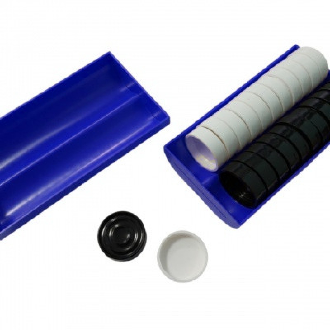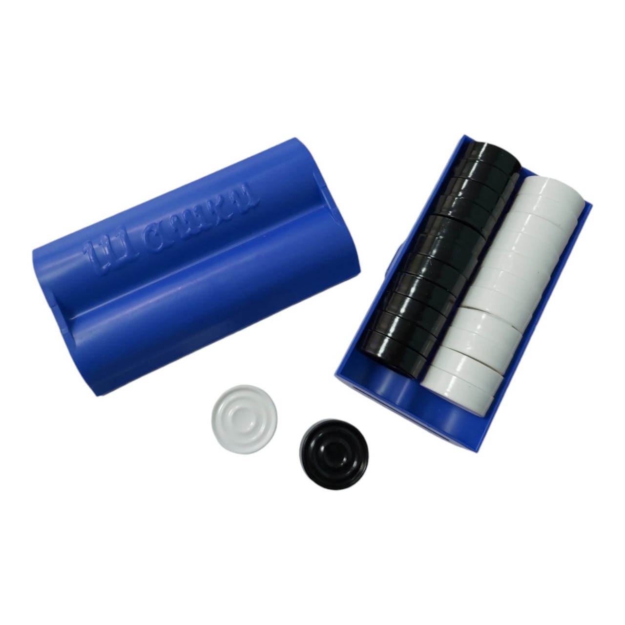 Набір для гри в шашки складається з 12 чорних та 12 білих пластмасових фішок, які упаковані у синій футляр для зберігання.