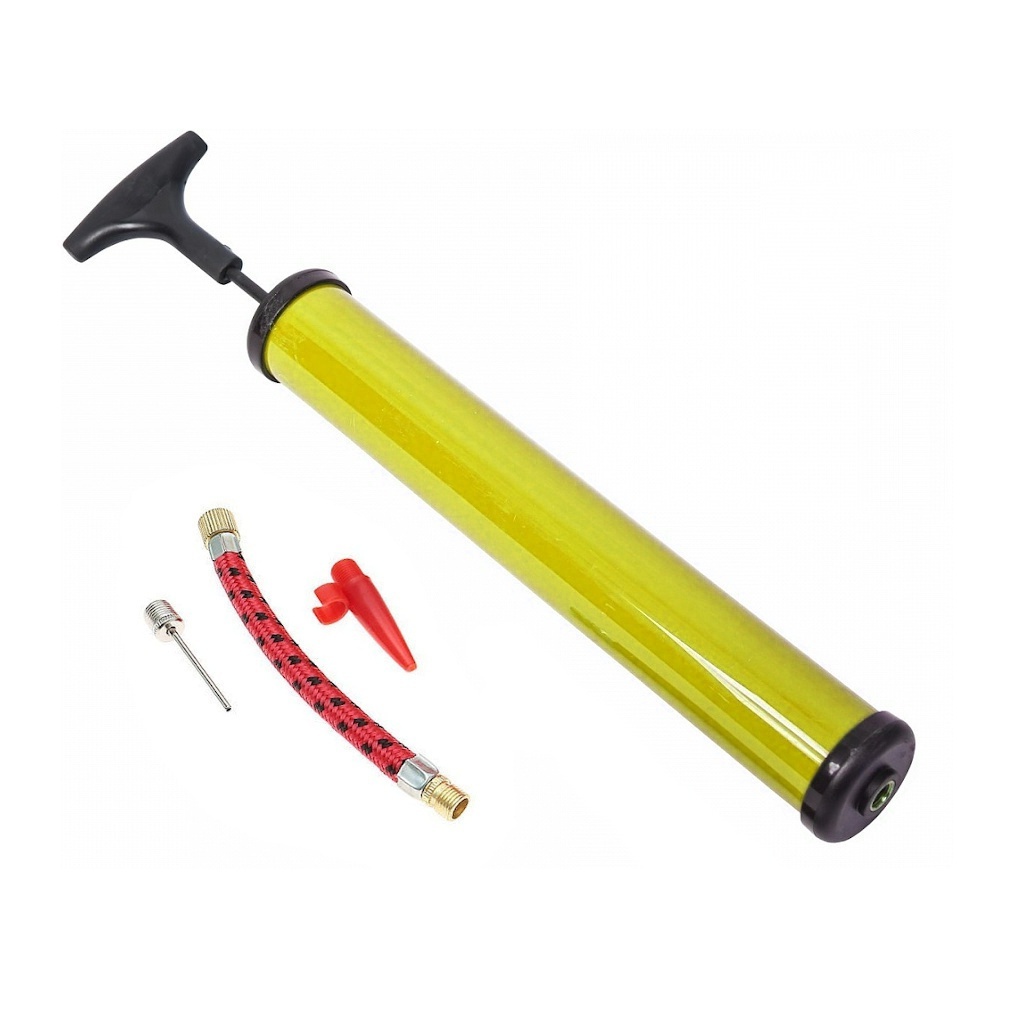 Насос використовують для накачування м’ячів та велосипедних камер. Насос накачує повітря за допомогою поршня. Під час ходу нагору поршень всмоктує атмосферне повітря через односторонній клапан. Під час низхідного ходу поршень витісняє повітря з насоса у виріб, що накачується. У комплекті з насосом поставляється: шлангочка, голка для накачування велосипедних камер та м’ячів, насадка для накачування надувних виробів.