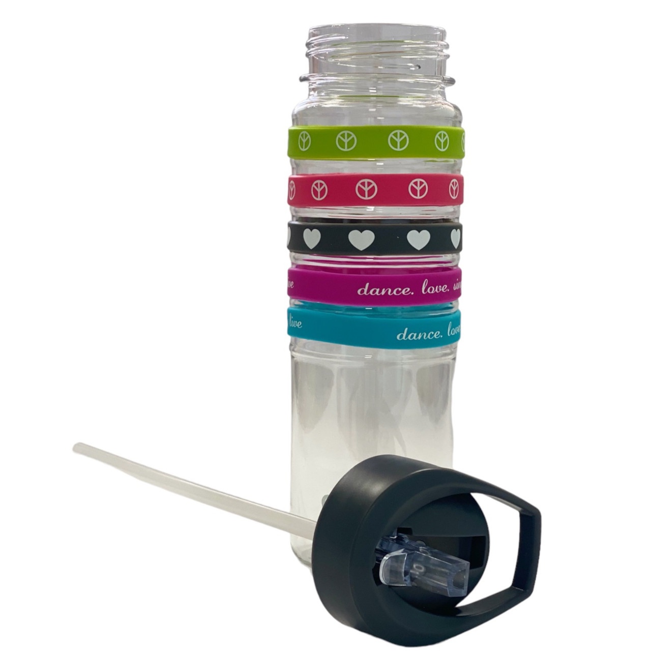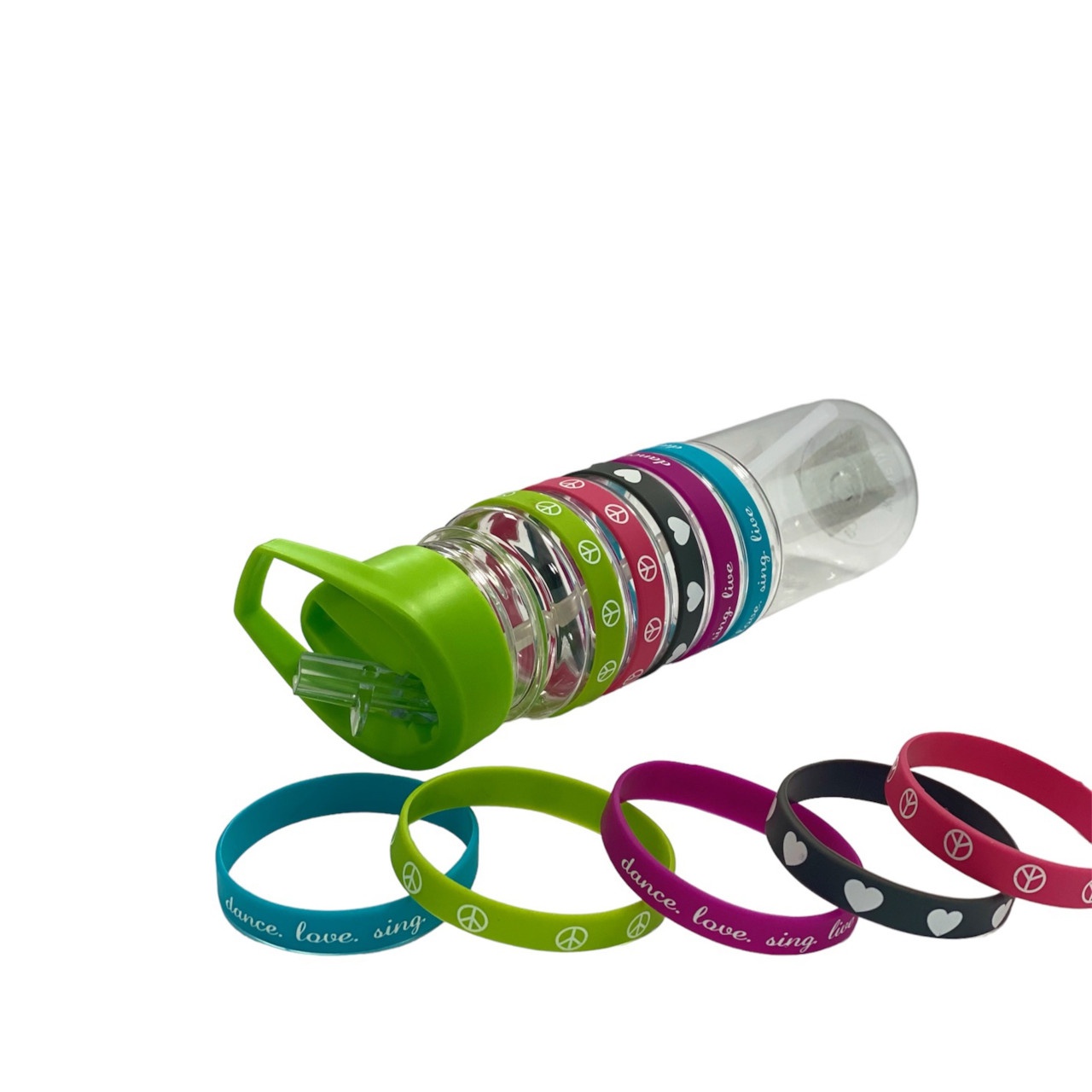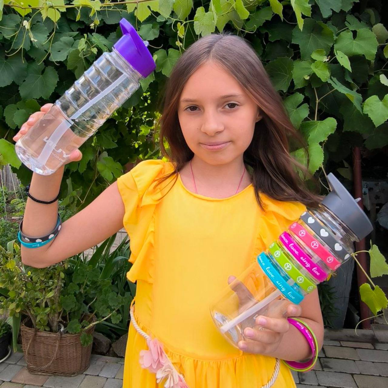 Пляшечка об’ємом 650 мл для зберігання рідин виготовлена з гіпоалергенного пластику. У пляшечки широка кришечка на різьбленні, складаний носик поїльника, трубочка. Дизайн виробу доповнений 5 яскравими силіконовими браслетами, які можна носити на руці.
