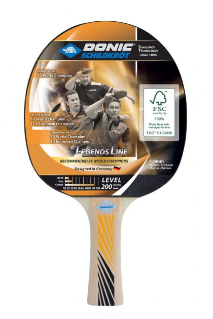 Ракетка для настільного тенісу Donic Legends 200 FSC – з дерева FSC® для базової гри без особливого досвіду. Гума з виступом, 1,0 мм, FSC-дерево, увігнута ручка, тип: Control.