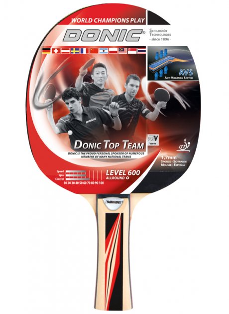 Ракетка для настільного тенісу «Top Team 600» від Donic підходить для використання у відпочинок і шкільних заняттях спортом, як для початківців, так і для любителів. Хороша якість дерева та ручки, ракетка також оснащена гумою Donic**, схваленою ITTF. Він має гладку поверхню з «пупчастою внутрішньою» конструкцією для розумної передачі техніки гри на м’яч (наприклад, обертання). Крім того, між деревиною та покриттям була використана губка товщиною 1,7 мм, яка забезпечує необхідну потужність, забезпечуючи розумний контроль. Вбудована технологія AVS (Anti Vibrations System) між лезом і рукояткою помітно зменшує вібрацію та коливання, що дозволяє зменшити втому під час гри з великим контролем і оптимальним зворотним зв’язком.
