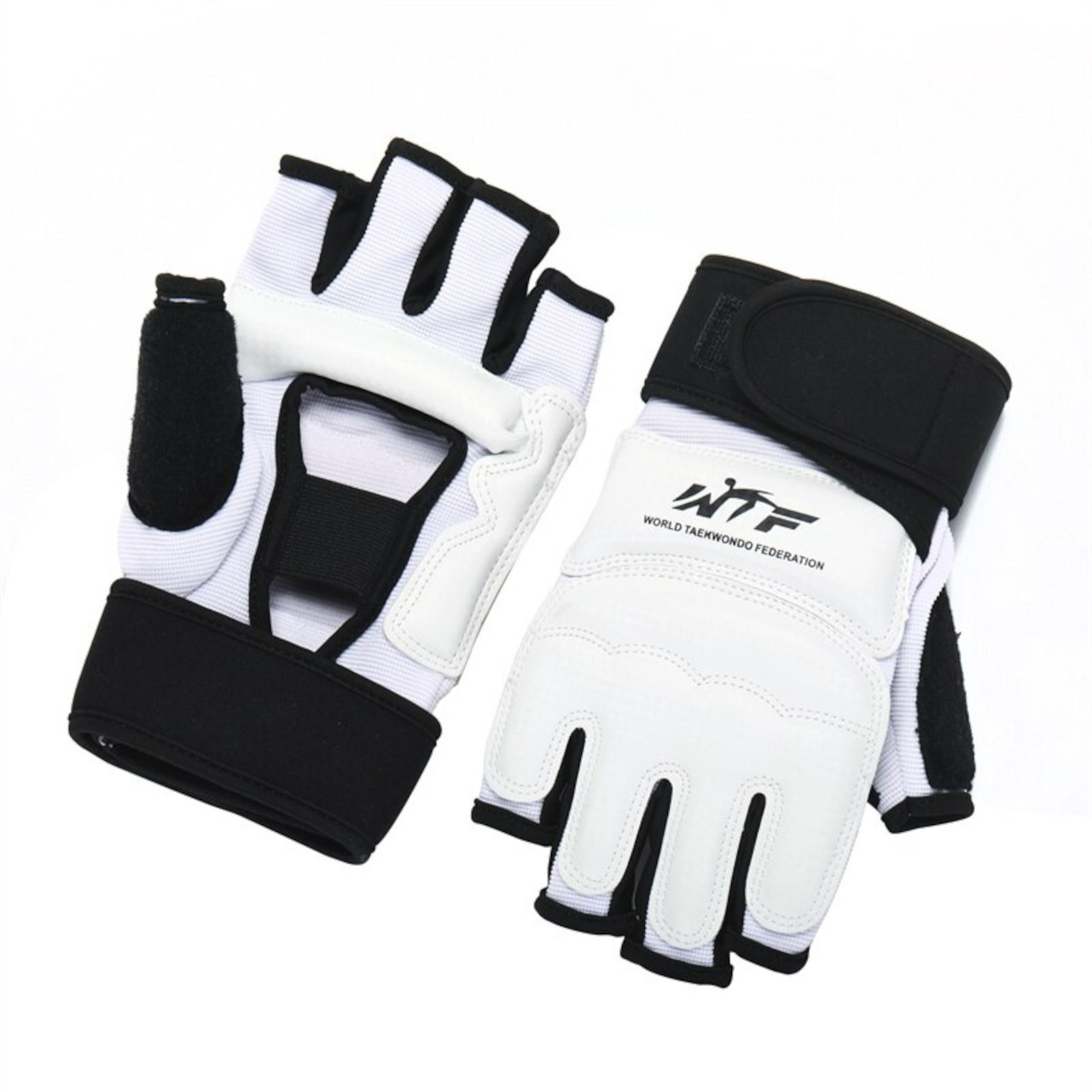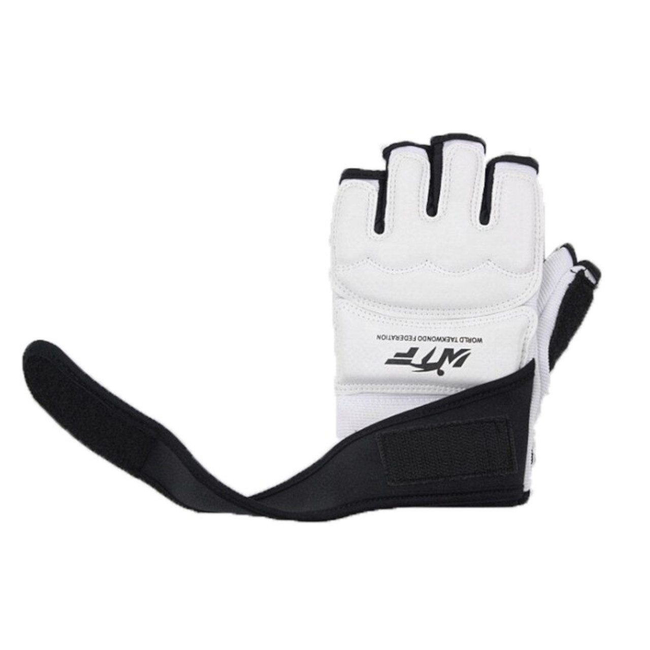 Рукавички без пальців для тхеквондо ВТФ виготовлені з міцного високоякісного шкірозамінника. Тильна сторона долоні має вставки зі спіненого ПВХ, що забезпечує захист під час ударів. М’яка вставка із махрової тканини на великому пальці призначена для зручності витирання поту з обличчя. Завдяки окремому дизайну пальців зручно здійснювати захоплення. Напульсник не тільки фіксує рукавичку, а й створює додаткову підтримку для суглобів під час тренувань. На рукавичках є друга липучка, що дозволяє регулювати розмір. Виріз на долоні дозволяє повітря циркулювати.
