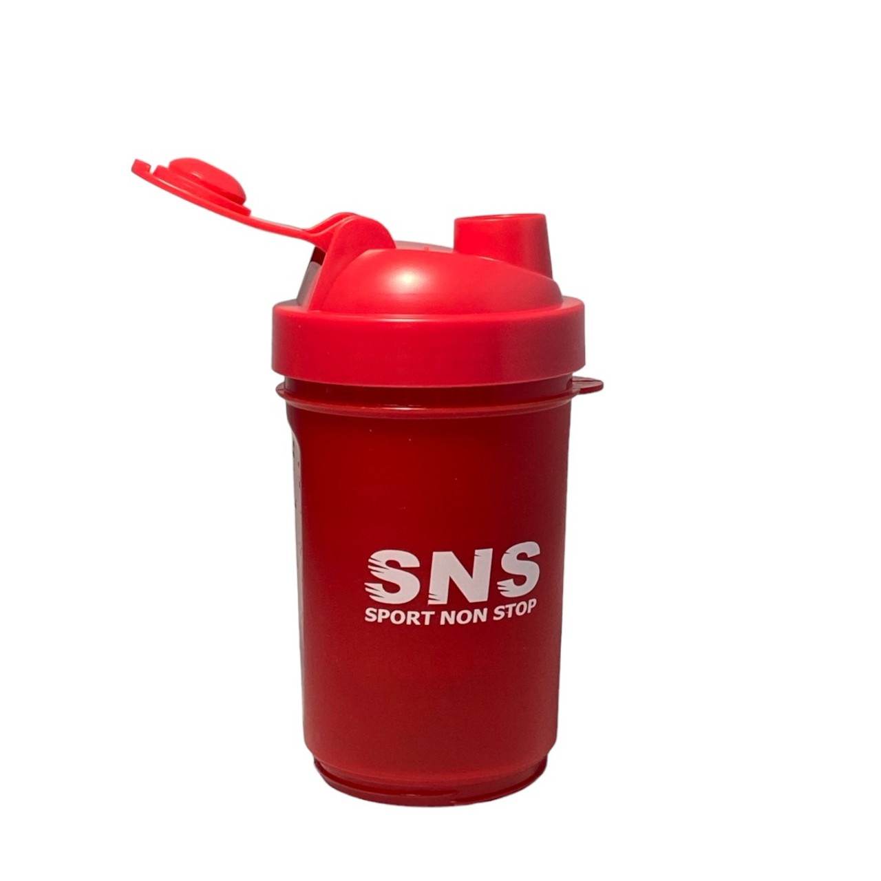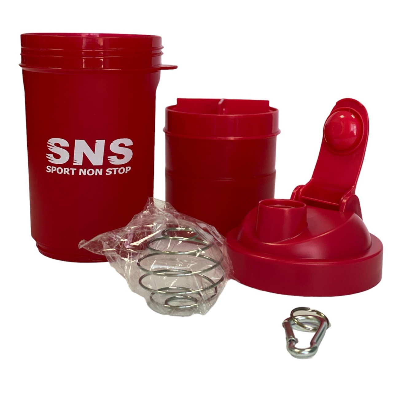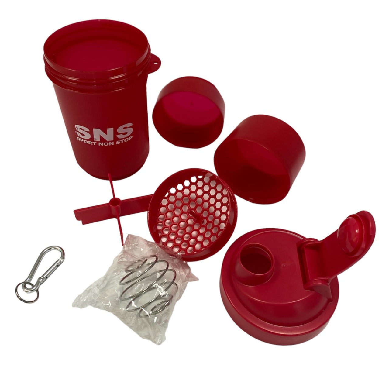Шейкер SNS місткість склянки становить 500 мл, розділений на 3 відсіки: основний для змішування та два для зберігання інгредієнтів. В один контейнер доданий роздільник на 4 відсіки для зберігання харчових добавок у вигляді капсул або таблеток. Спеціальне спіральне металеве ситечко зі зручною ручкою рівномірно розмішує будь-який навіть найгустіший протеїн або гейнер.