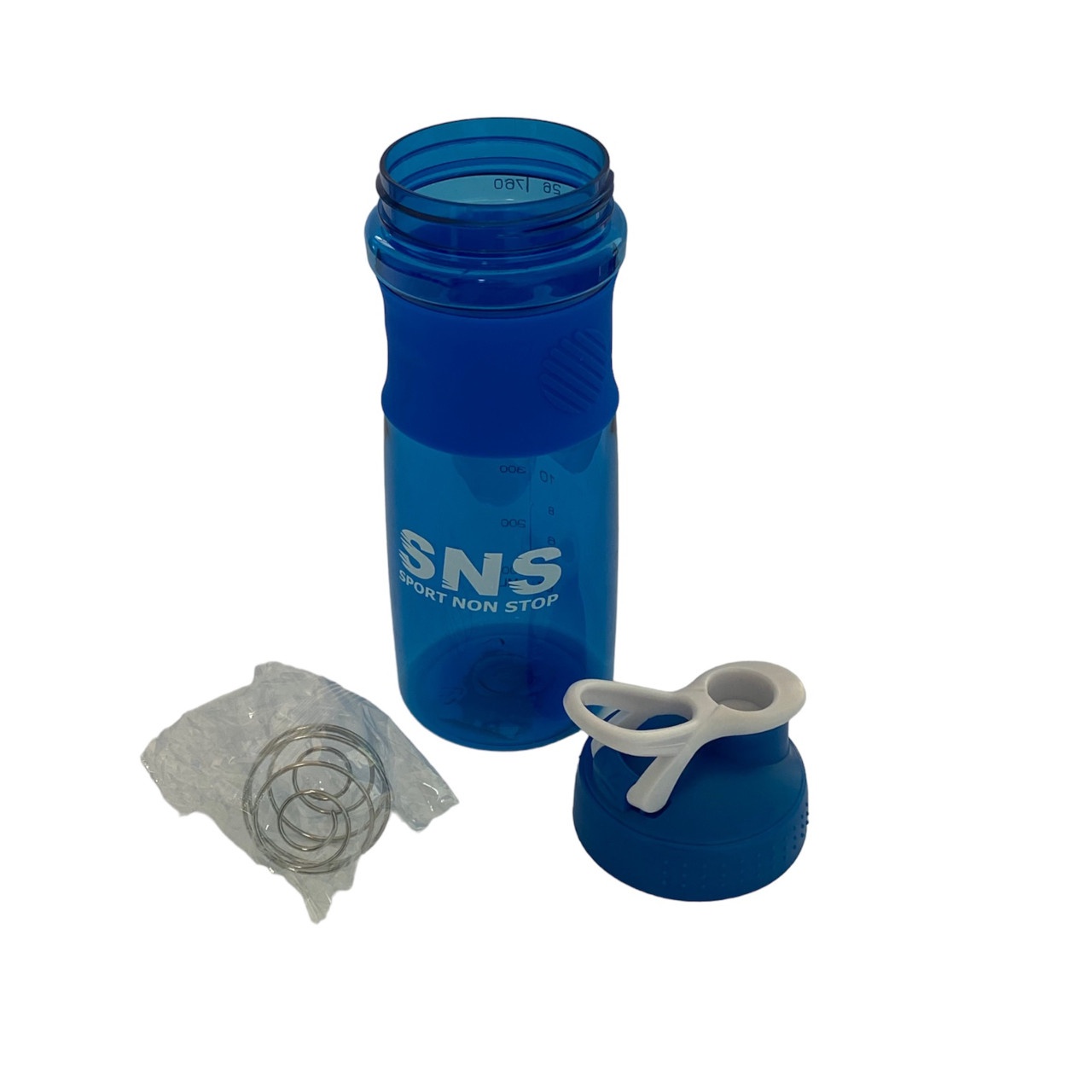 Шейкер виготовлений із прозорого пластику з прогумованою стрічкою біля основи, доповнений запірним механізмом із петлею для ключів. Спеціальний віночок у вигляді кульки змішує навіть найщільніші інгредієнти.