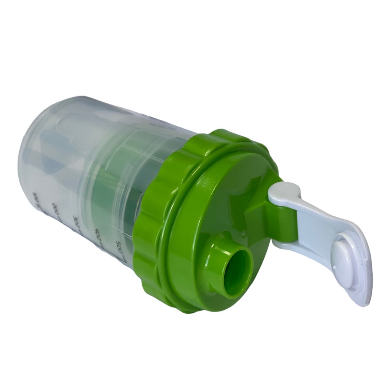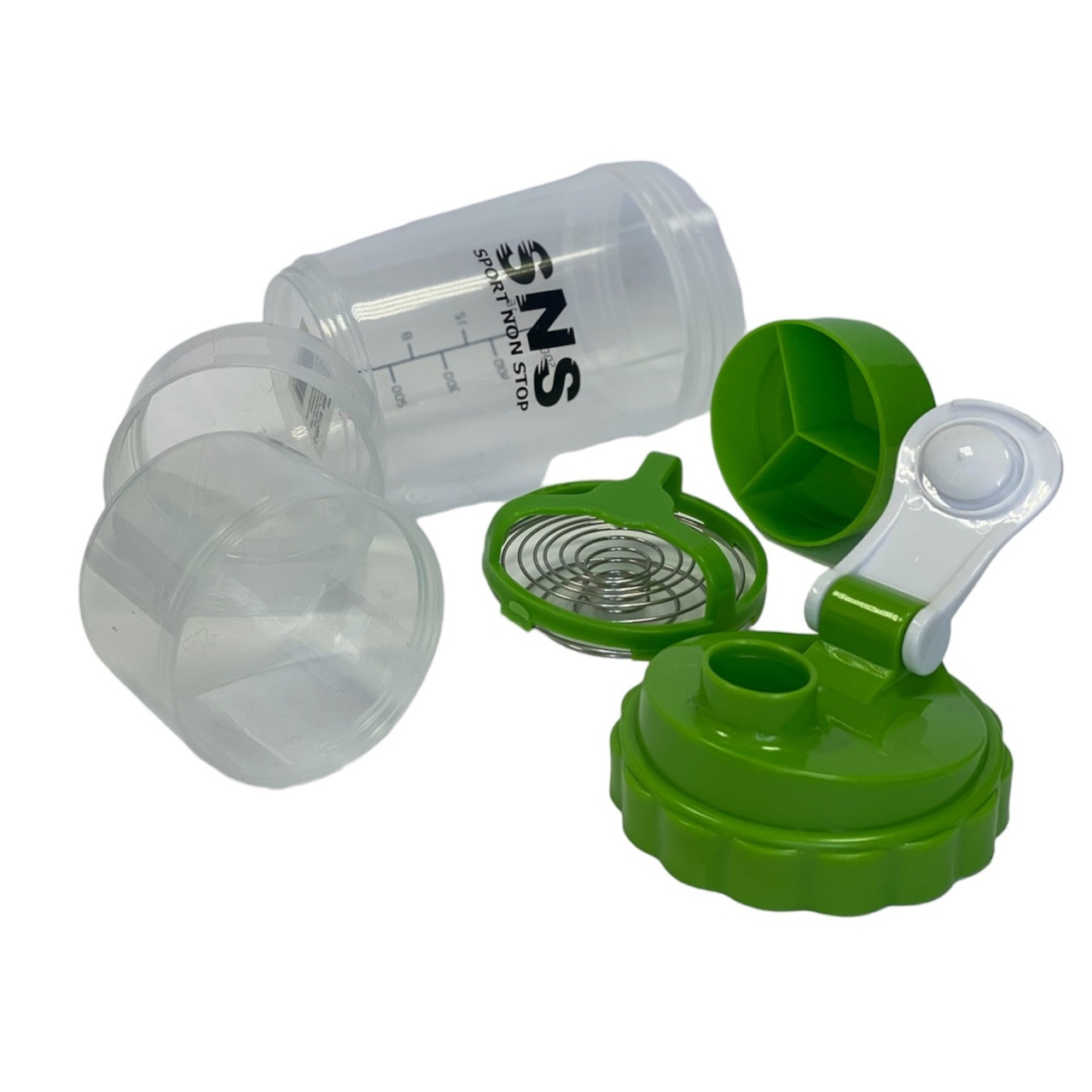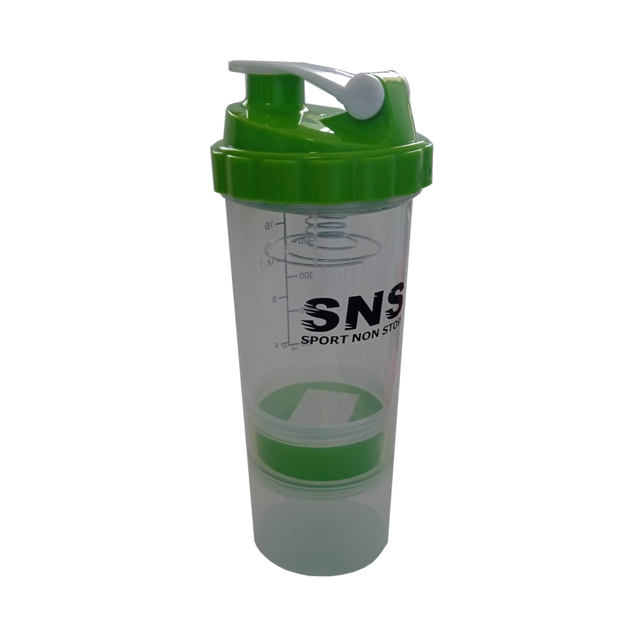 Шейкер SNS місткість склянки становить 500 мл, розділений на 3 відсіки: основний для змішування та два для зберігання інгредієнтів. В один контейнер доданий роздільник на 4 відсіки для зберігання харчових добавок у вигляді капсул або таблеток. Спеціальне спіральне металеве ситечко зі зручною ручкою рівномірно розмішує будь-який навіть найгустіший протеїн або гейнер.