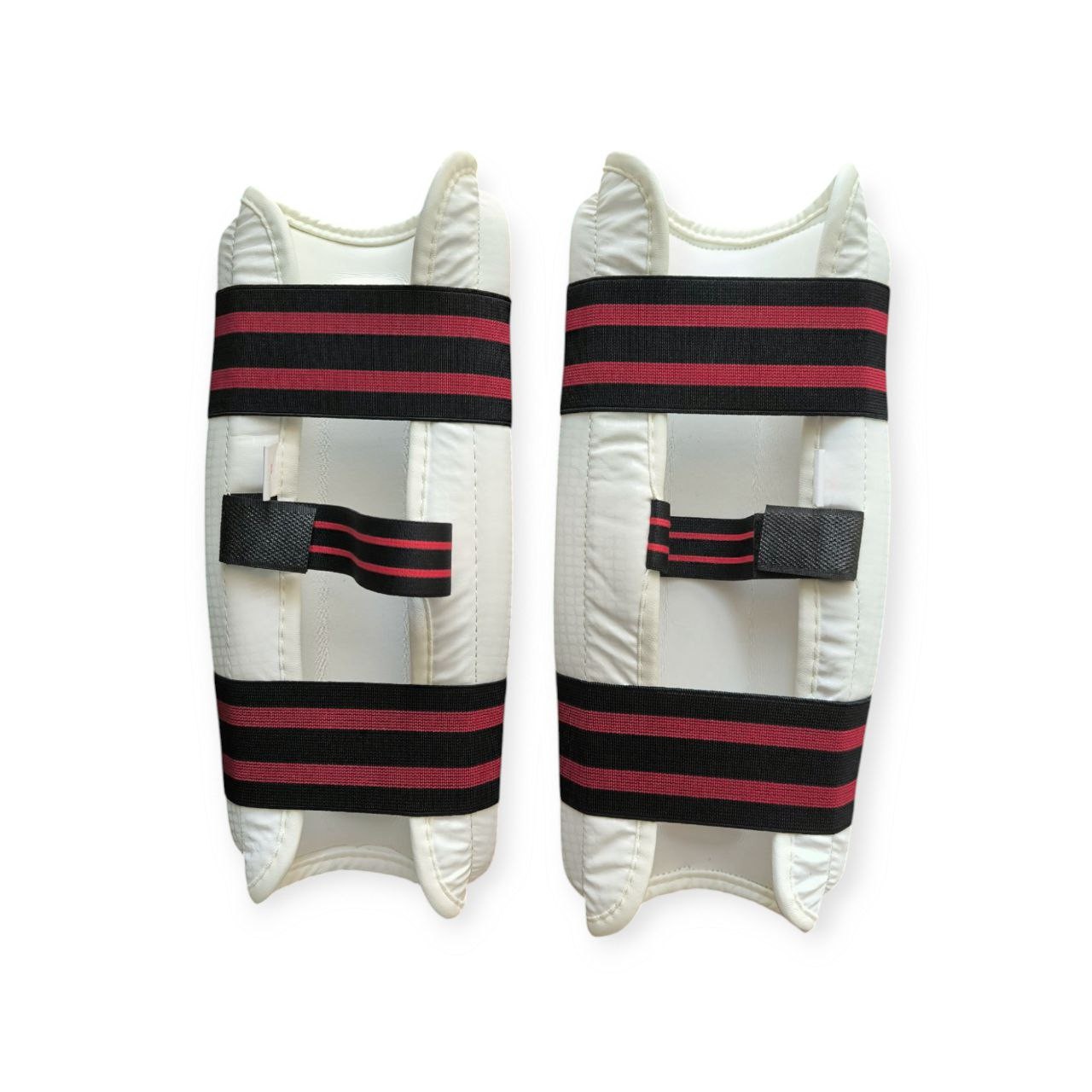 Щитки для гомілки виготовлені зі штучної шкіри з EVA-наповненням, що забезпечує амортизацію ударного впливу та захист під час тренувань. Щитки доповнені двома еластичними ремінцями на липучці, що забезпечує зручну фіксацію на нозі. Виріб застосовується тхеквондистами під час тренувального та змагального процесів.