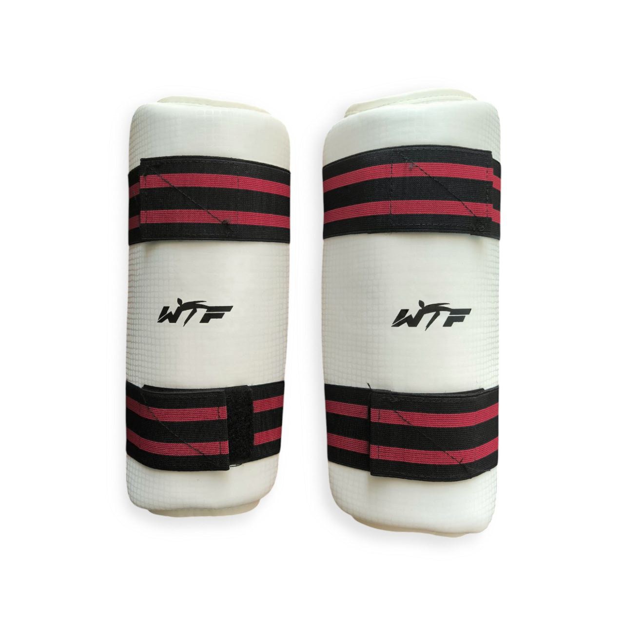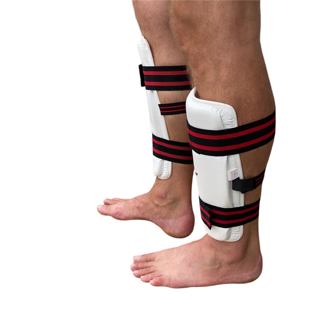 Щитки для гомілки виготовлені зі штучної шкіри з EVA-наповненням, що забезпечує амортизацію ударного впливу та захист під час тренувань. Щитки доповнені двома еластичними ремінцями на липучці, що забезпечує зручну фіксацію на нозі. Виріб застосовується тхеквондистами під час тренувального та змагального процесів.