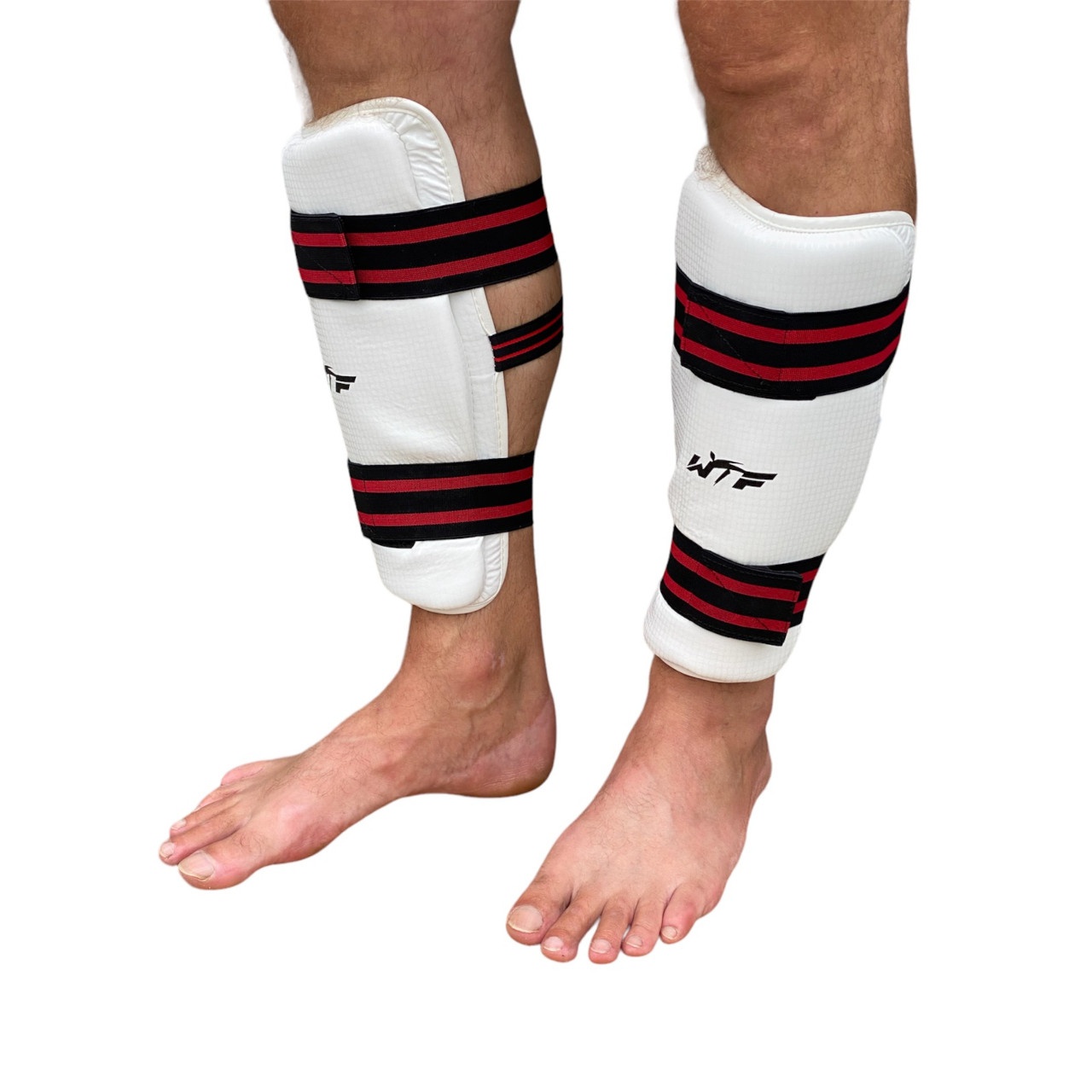 Щитки для гомілки виготовлені зі штучної шкіри з EVA-наповненням, що забезпечує амортизацію ударного впливу та захист під час тренувань. Щитки доповнені двома еластичними ремінцями на липучці, що забезпечує зручну фіксацію на нозі. Виріб застосовується тхеквондистами під час тренувального та змагального процесів.