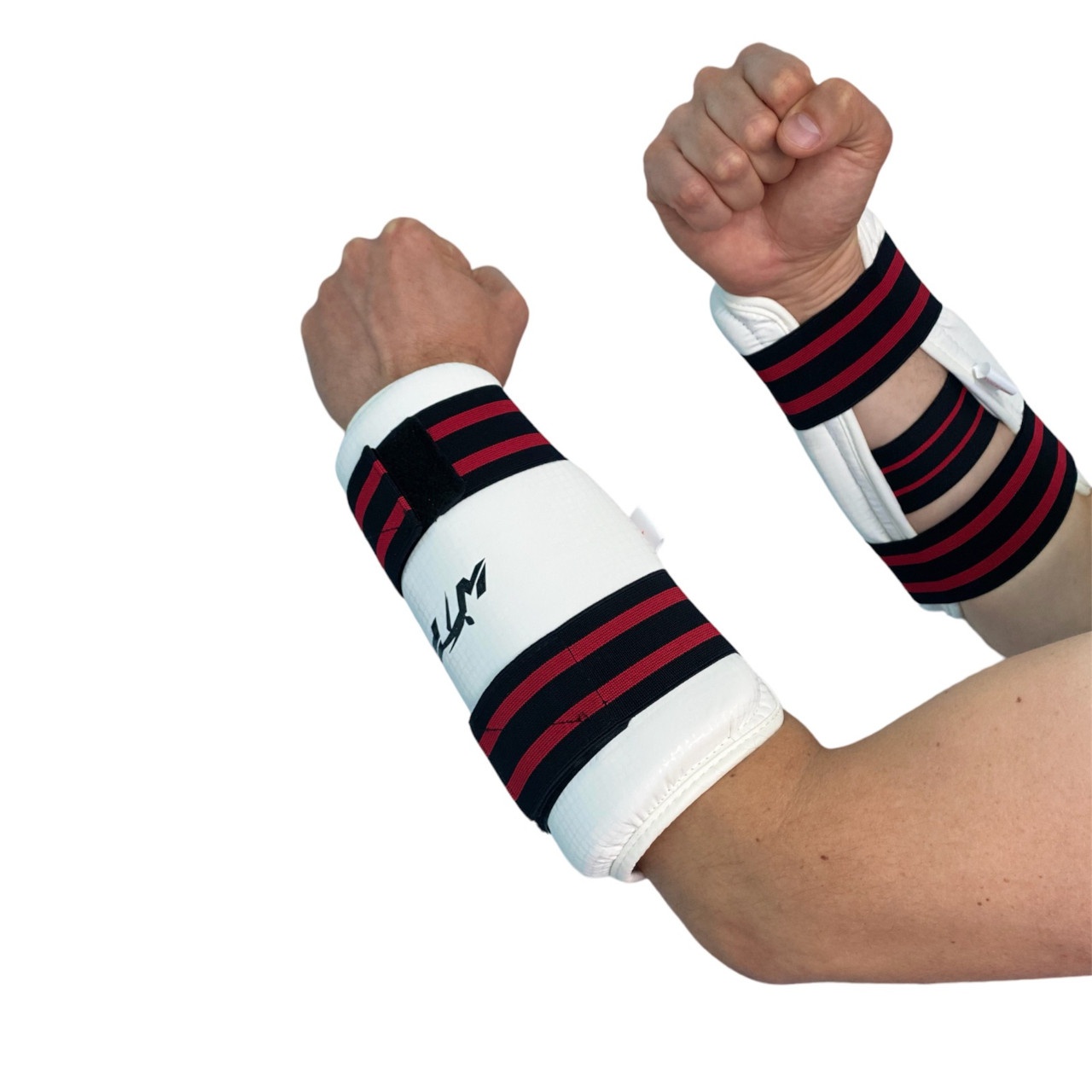 Щитки для передпліччя виготовлені зі штучної шкіри з EVA-наповненням, що забезпечує амортизацію ударного впливу та захист під час тренувань. Щитки доповнені двома еластичними ремінцями на липучці, що забезпечує зручну фіксацію на руці. Виріб застосовується тхеквондистами під час тренувального та змагального процесів.