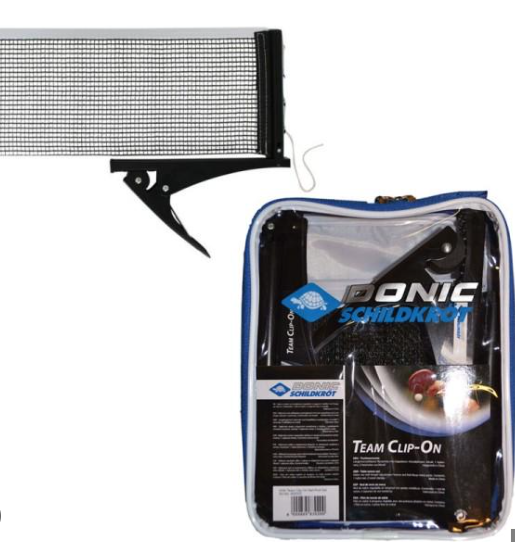 Популярна сітка для настільного тенісу Team Clip On від Schildkröt вражає цікавим співвідношенням ціни та якості. Практичне кріплення затискачем (схоже на так званий клейовий затискач) дозволяє швидко збирати та розбирати без гвинтів. Просто відкрийте затискач і посуньте його на тарілку. Додаткові гумові вставки, а також дуже щільна пружина механізму кліпси забезпечують міцну та нековзку посадку, міцну металеву конструкцію, складні стійки для невеликого транспортного розміру. Сітка виготовлена з нейлону, міцна та стійка до атмосферних впливів і може бути натягнута за допомогою різьбового шнура. Повний комплект сітки поставляється в практичній сумці для перенесення на блискавці та ручці для перенесення. Його можна швидко та легко зібрати та розібрати, що робить його ідеальним компаньйоном для столів для настільного тенісу без сітки. Максимальна товщина плити 3,5 см.