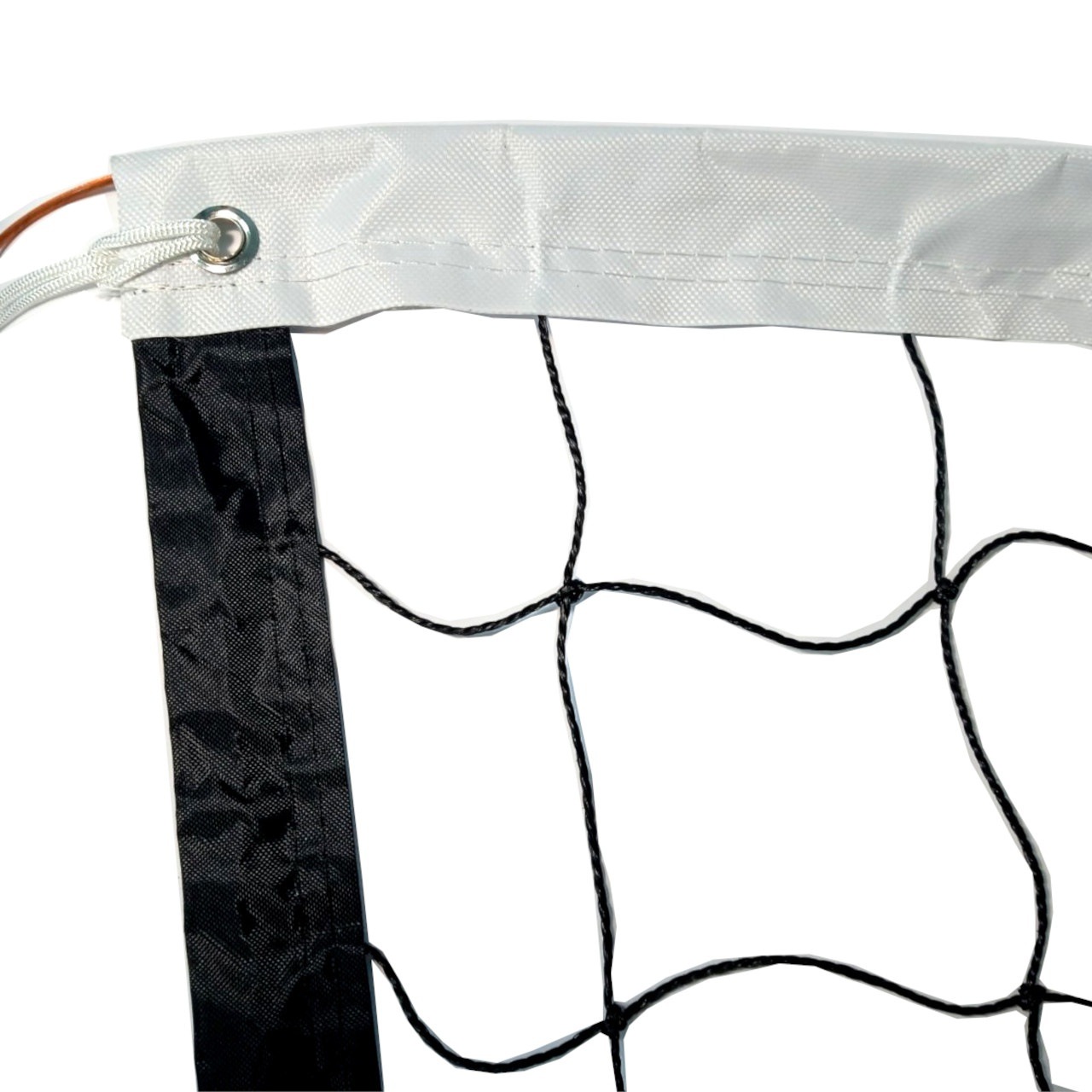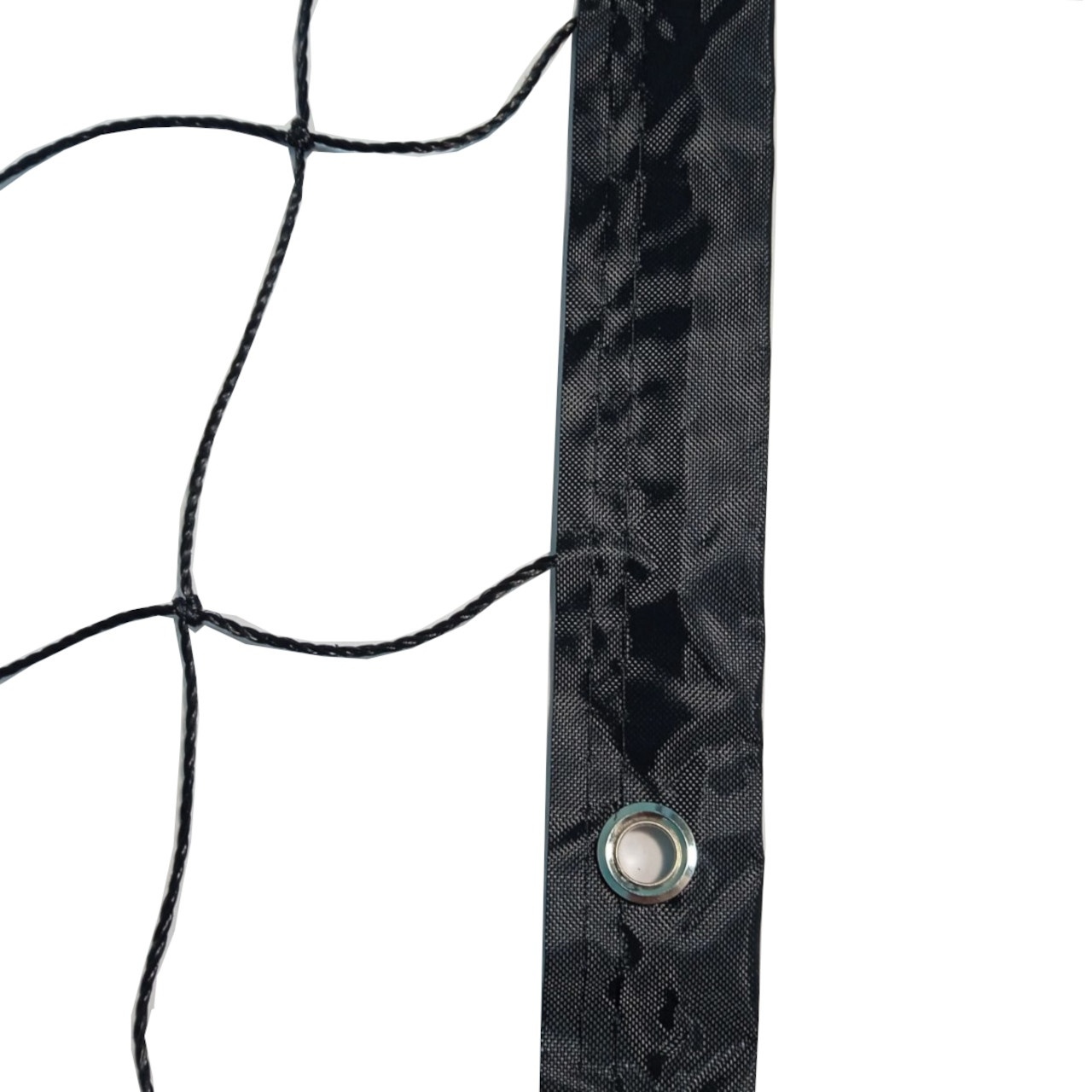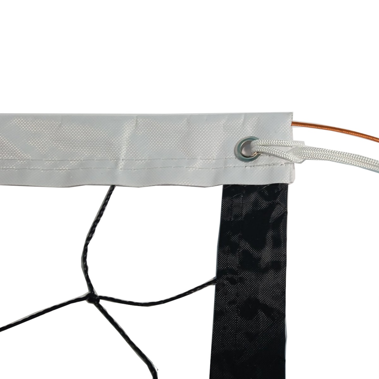 Верхній край сітки обшитий горизонтальною стрічкою шириною 50 см (складений удвічі білий ПВХ-матеріал, прошитий по всій довжині). На кінцях стрічки є отвори, через які пропущений шнур, що прив’язує стрічку до стійок для її натягу. Усередині стрічки знаходиться гнучкий трос для надійного кріплення та рівномірного натягу. Внизу сітки також передбачений шнур, пропущений через комірки, для додаткового кріплення до стійок і натягу.