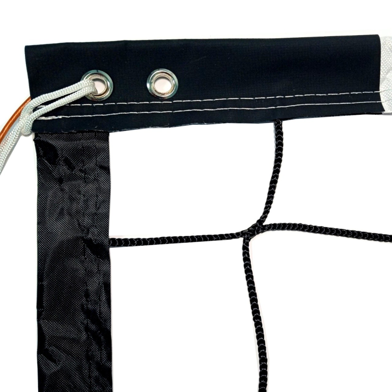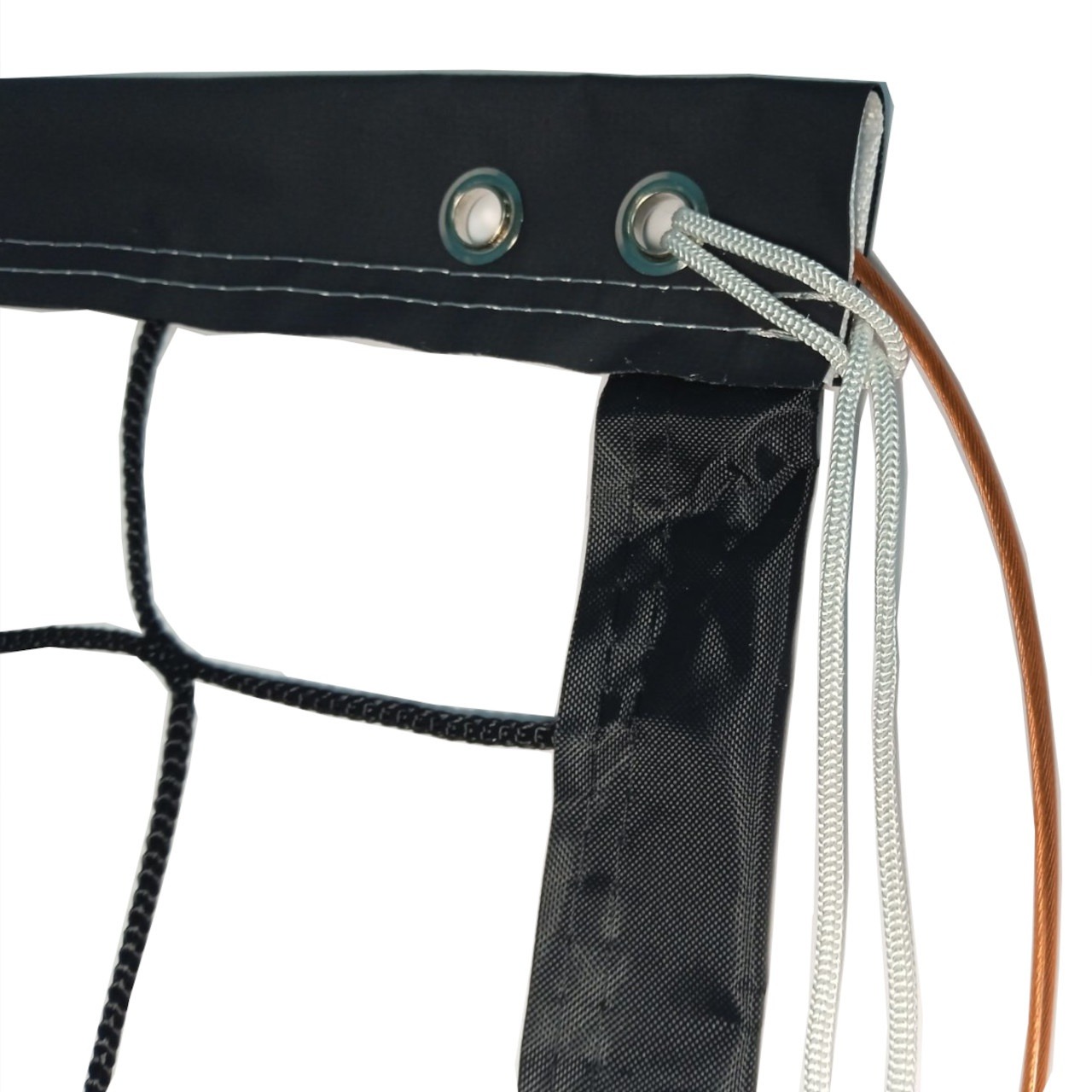 Верхній край сітки обшитий горизонтальною стрічкою шириною 50 см (складений удвічі білий ПВХ-матеріал, прошитий по всій довжині). На кінцях стрічки є отвори, через які пропущений шнур, що прив’язує стрічку до стійок для її натягу. Усередині стрічки знаходиться гнучкий трос для кріплення сітки до стійок та рівномірного натягу. Внизу сітки також передбачений шнур, пропущений через комірки, для додаткового кріплення до стійок і натягу.