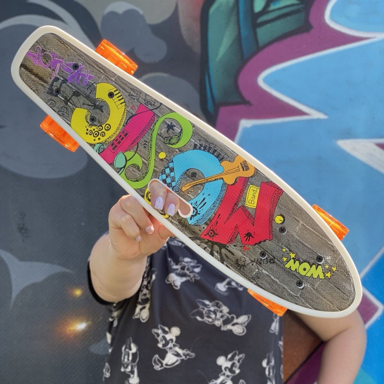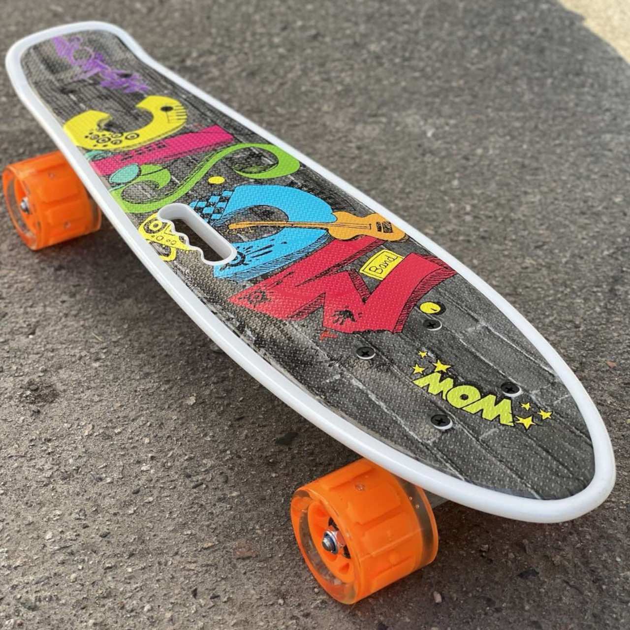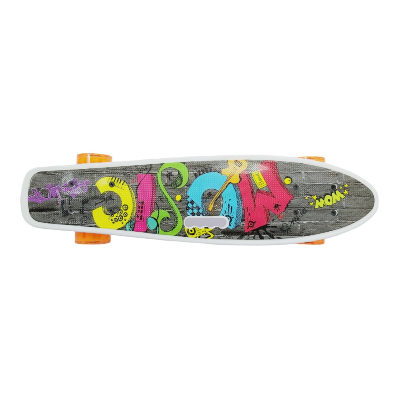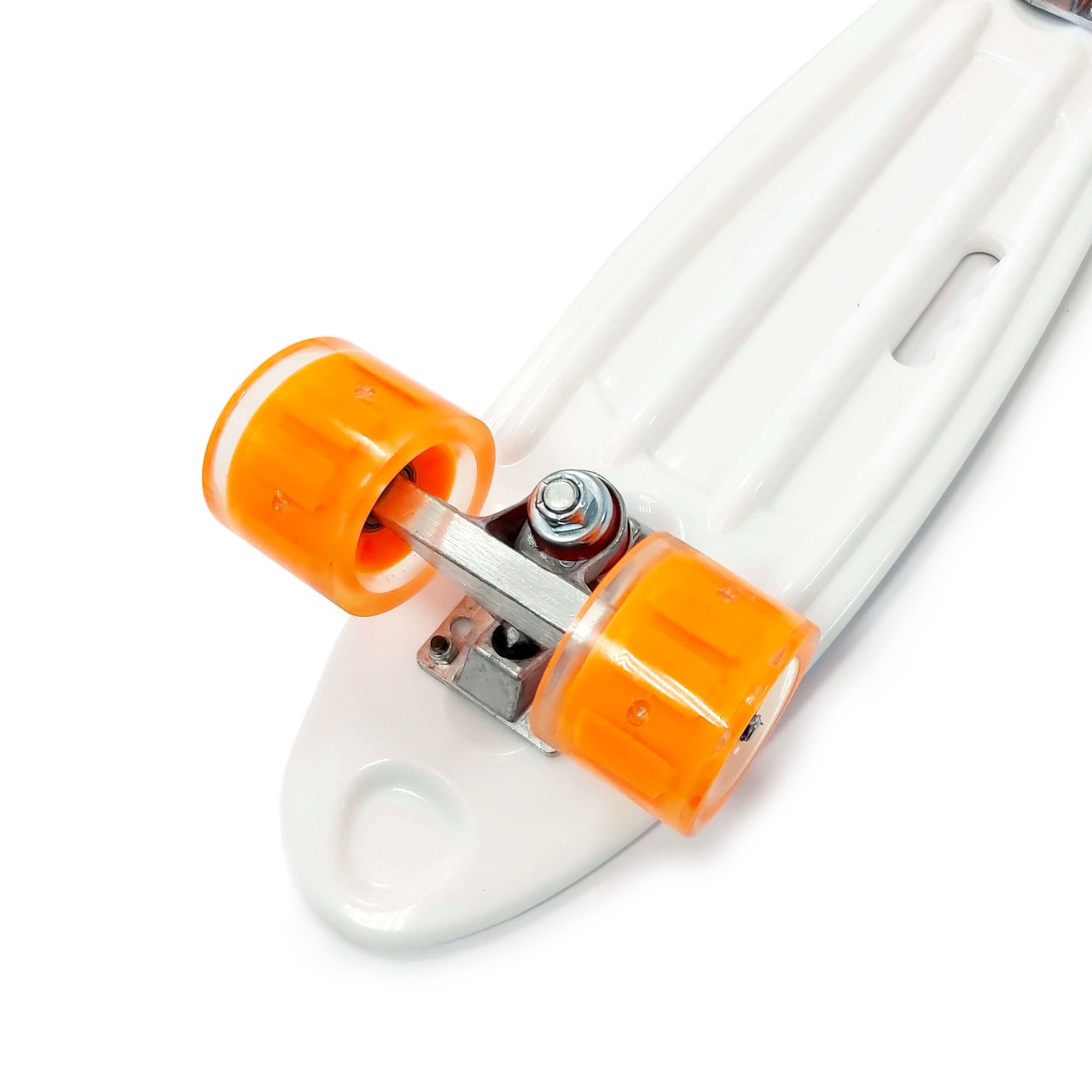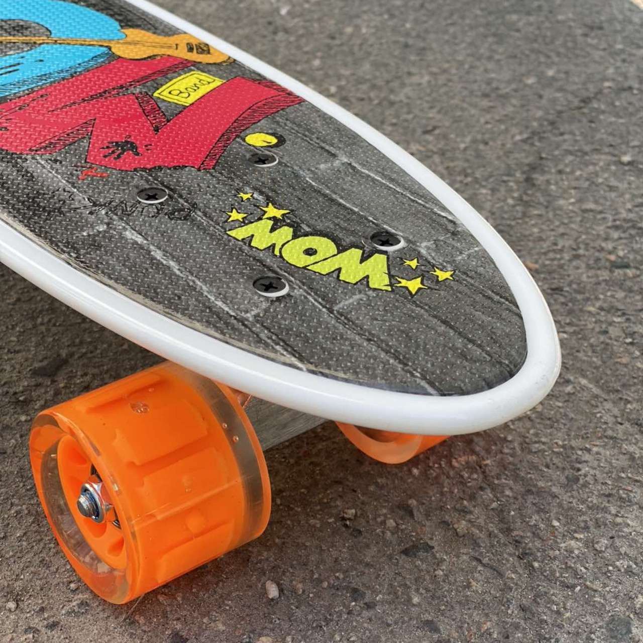Скейт із декою загнутою з однієї, хвостової частини. На ньому можна зручно кататися вулицями міста. Міні-круїзер має зручні габарити, що дозволяє пристібати їх до рюкзака спеціальними ременями або носити в чохлі. Колеса на міні-скейті світяться при обертанні коліс. Широкі PVC колеса забезпечують приємне та комфортне катання. Відмінний накат дошці додають підшипники ABEC-7. На деку нанесений малюнок, що надає стильного вигляду. Є зручна прорізна ручка для перенесення.