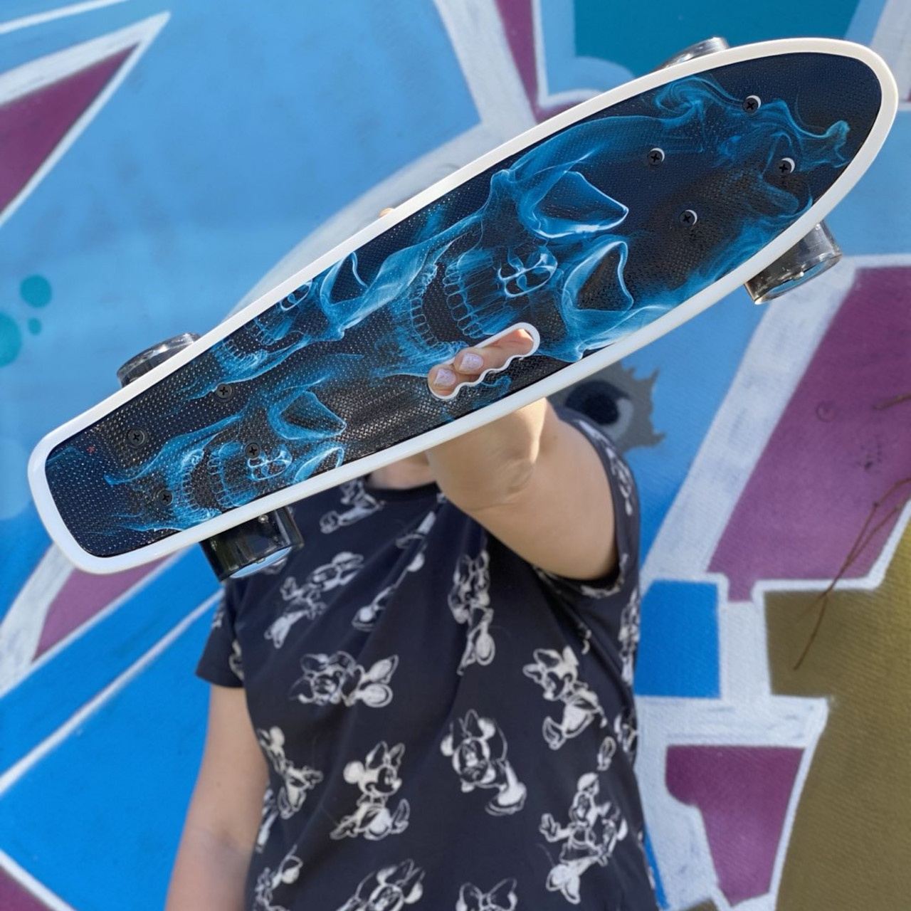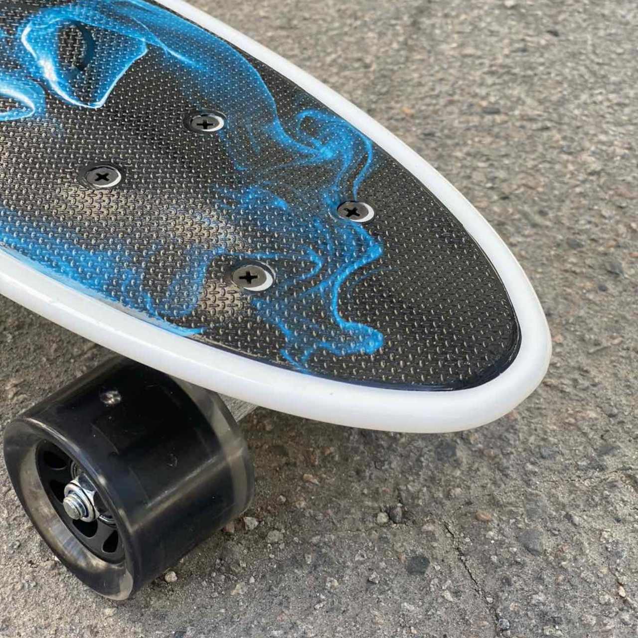 Скейт із декою загнутою з однієї, хвостової частини. На ньому можна зручно кататися вулицями міста. Міні-круїзер має зручні габарити, що дозволяє пристібати їх до рюкзака спеціальними ременями або носити в чохлі. Колеса на міні-скейті світяться при обертанні коліс. Широкі PVC колеса забезпечують приємне та комфортне катання. Відмінний накат дошці додають підшипники ABEC-7. На деку нанесений малюнок, що надає стильного вигляду. Є зручна прорізна ручка для перенесення.
