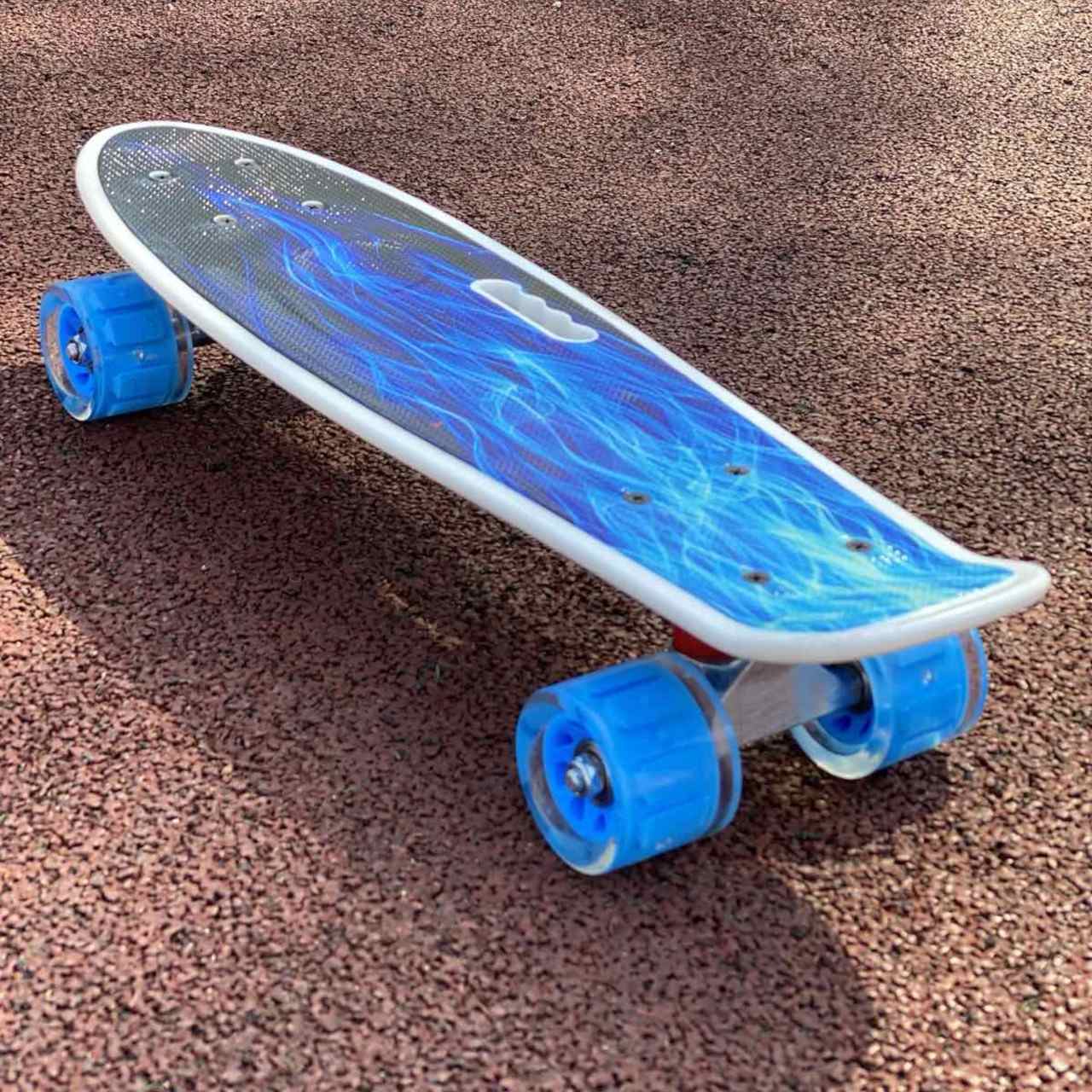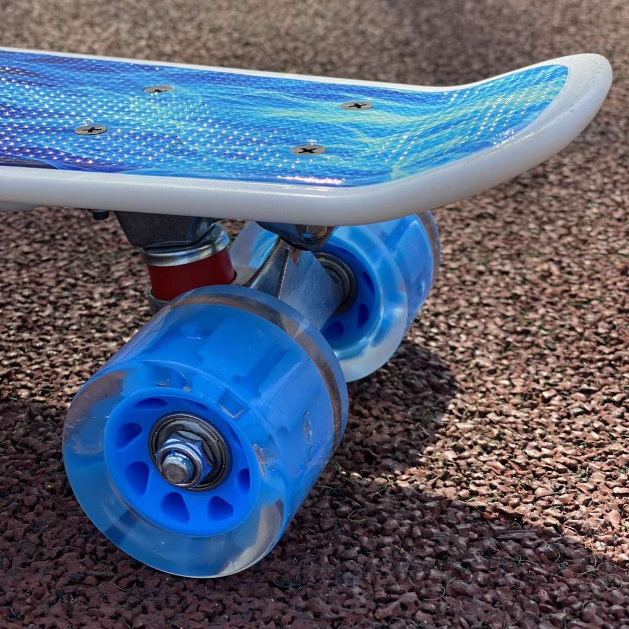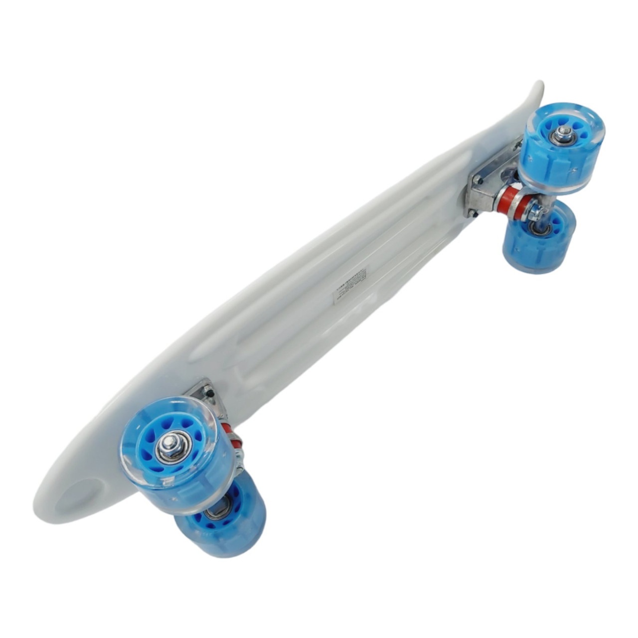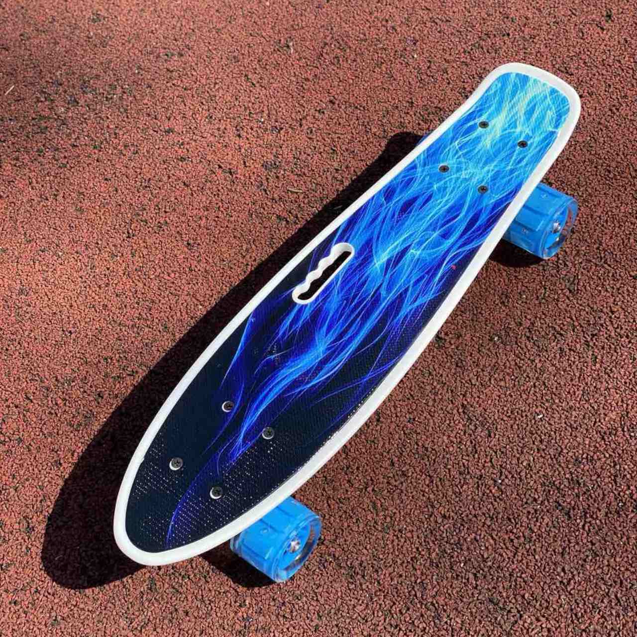 Скейт із декою загнутою з однієї, хвостової частини. На ньому можна зручно кататися вулицями міста. Міні-круїзер має зручні габарити, що дозволяє пристібати їх до рюкзака спеціальними ременями або носити в чохлі. Колеса на міні-скейті світяться при обертанні коліс. Широкі PVC колеса забезпечують приємне та комфортне катання. Відмінний накат дошці додають підшипники ABEC-7. На деку нанесений малюнок, що надає стильного вигляду. Є зручна прорізна ручка для перенесення.