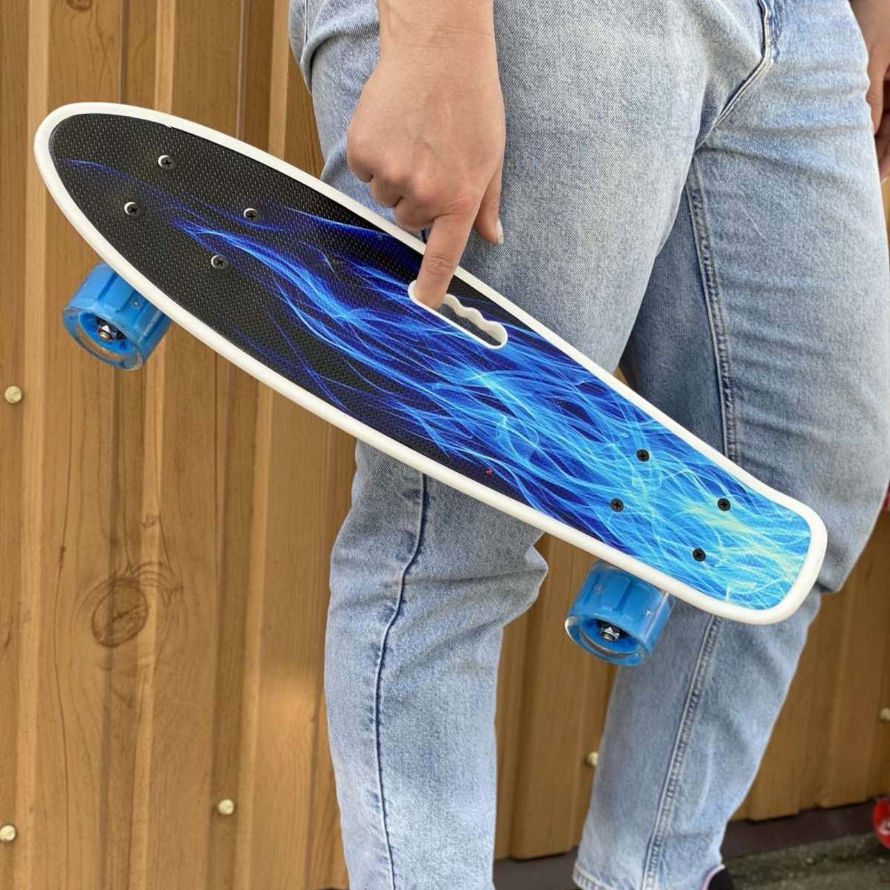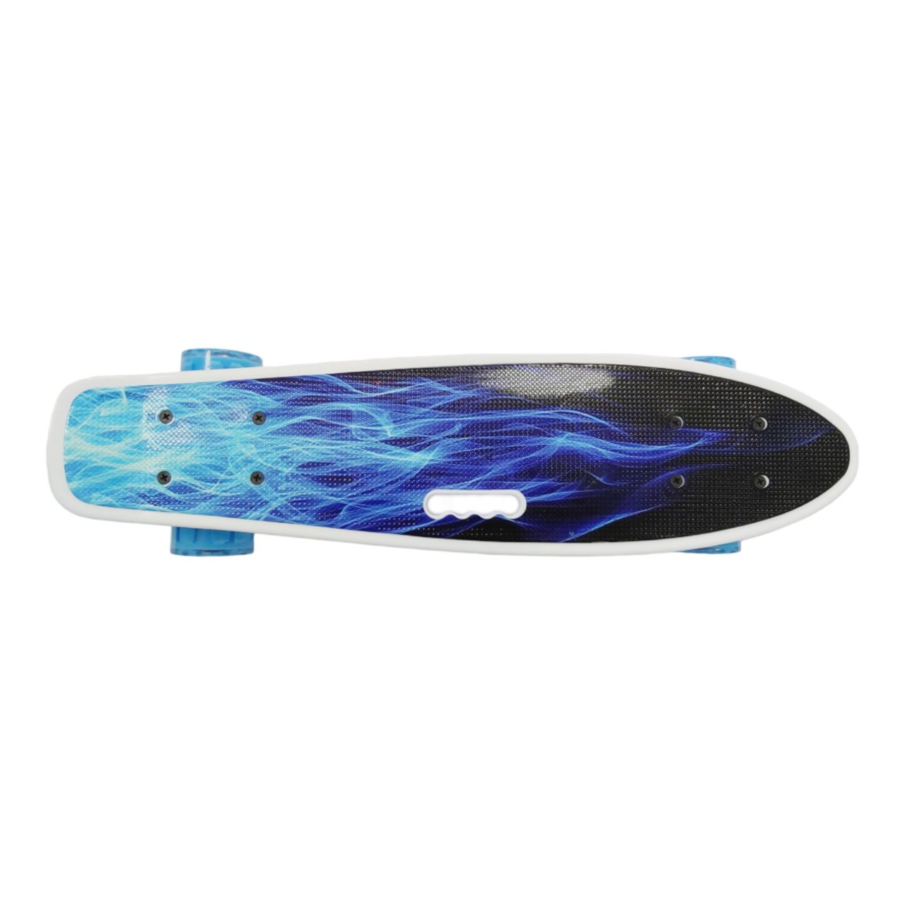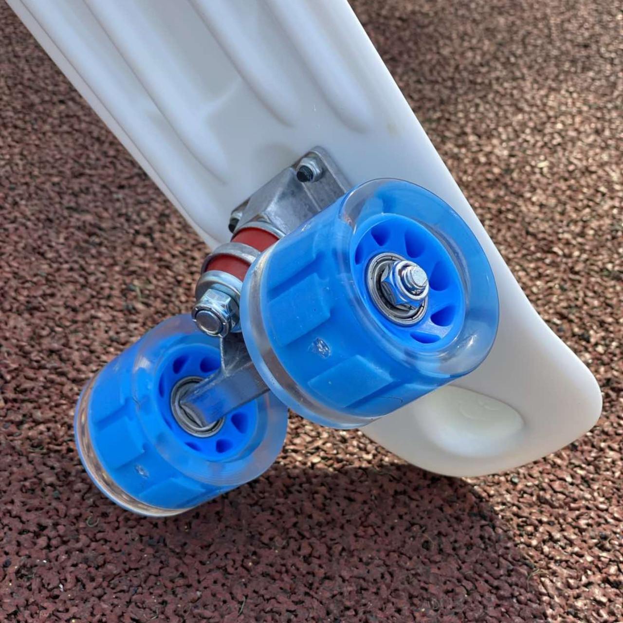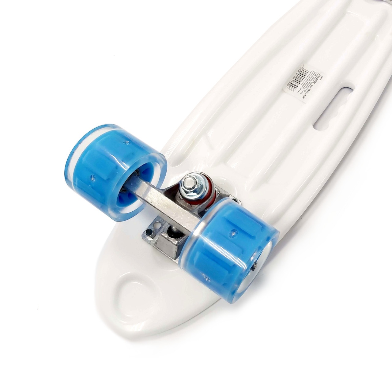 Скейт із декою загнутою з однієї, хвостової частини. На ньому можна зручно кататися вулицями міста. Міні-круїзер має зручні габарити, що дозволяє пристібати їх до рюкзака спеціальними ременями або носити в чохлі. Колеса на міні-скейті світяться при обертанні коліс. Широкі PVC колеса забезпечують приємне та комфортне катання. Відмінний накат дошці додають підшипники ABEC-7. На деку нанесений малюнок, що надає стильного вигляду. Є зручна прорізна ручка для перенесення.