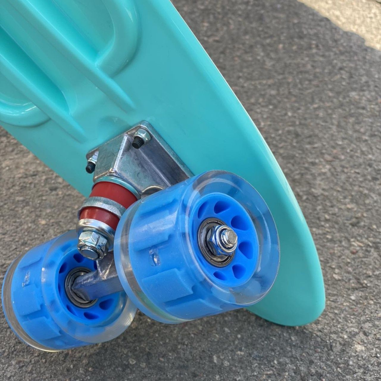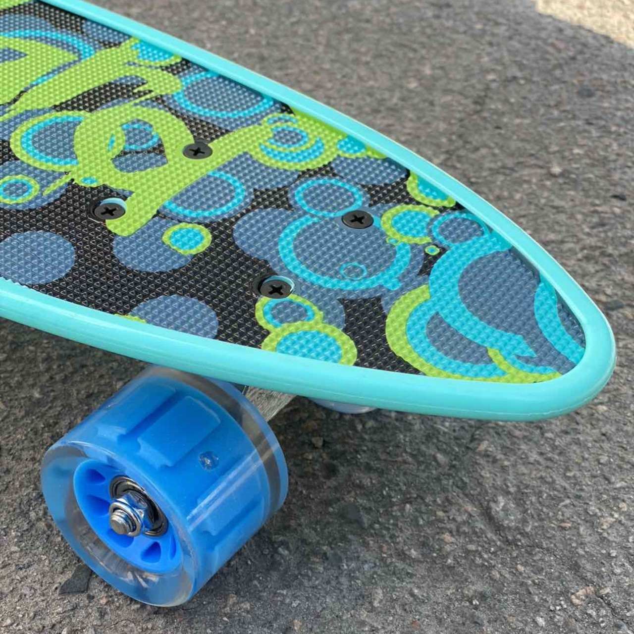 Невеликий скейт із яскравим дизайном, підійде як для дітей 4-5 років, так і для підлітків. Дека скейту виконана із міцного легкого пластику, що дозволяє набирати велику швидкість та виконувати різні трюки. Алюмінієва підвіска, поліуретанові колеса, що світяться, з алюмінієвою серцевиною.