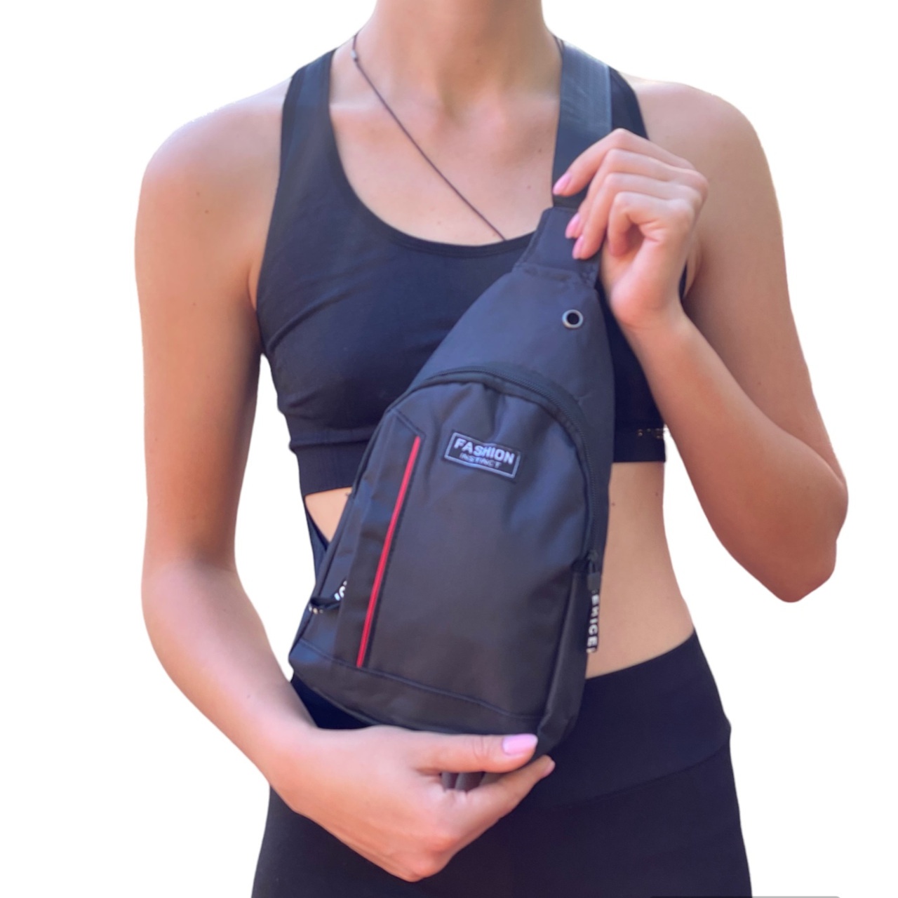 Сумка-слінг – міні-рюкзак на одне плече невеликого розміру з однією шлейкою випонена із міцного зносостійкого матеріалу. Сумка складається з одного відділення, яке має внутрішню кишеньку на блискавці. Зверху доповнена прорізною кишенею на блискавці збоку. Верхній клапан сумочки має отвір, через який можна просмикнути навушники.