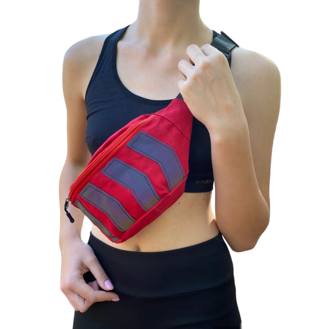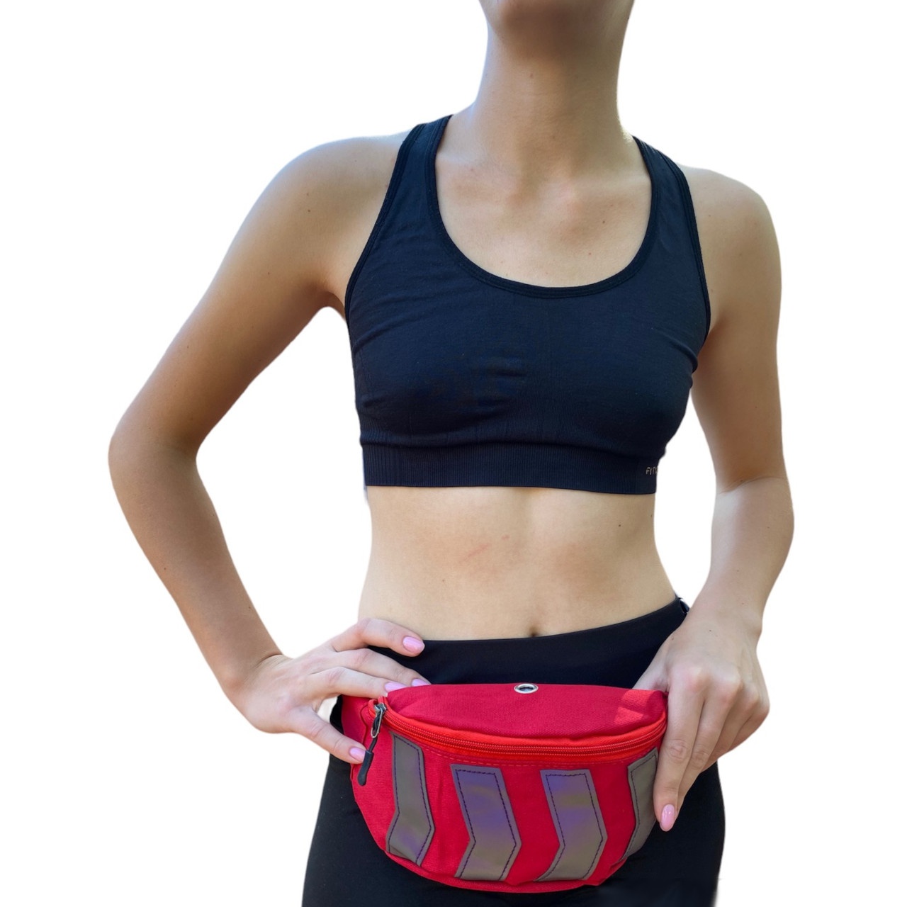 Сумка на пояс із джутової тканини та льону, зверху нанесені 4 світловідбиваючі смуги. Сумка має одне відділення, яке закривається на блискавку. Поясний ремінець, що регулюється, застібається за допомогою пластикового карабіну. На верхньому клапані сумочки є отвір для навушників.