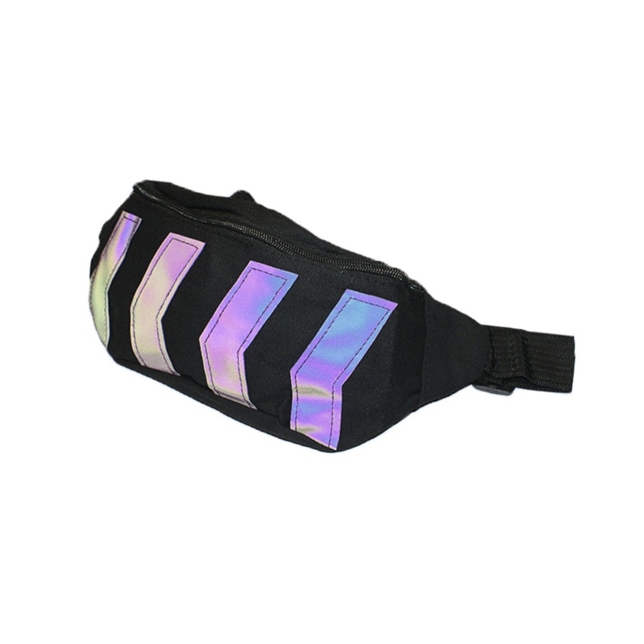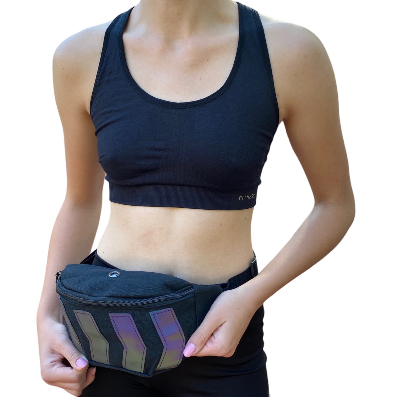 Сумка на пояс із джутової тканини та льону, зверху нанесені 4 світловідбиваючі смуги. Сумка має одне відділення, яке закривається на блискавку. Поясний ремінець, що регулюється, застібається за допомогою пластикового карабіну. На верхньому клапані сумочки є отвір для навушників.