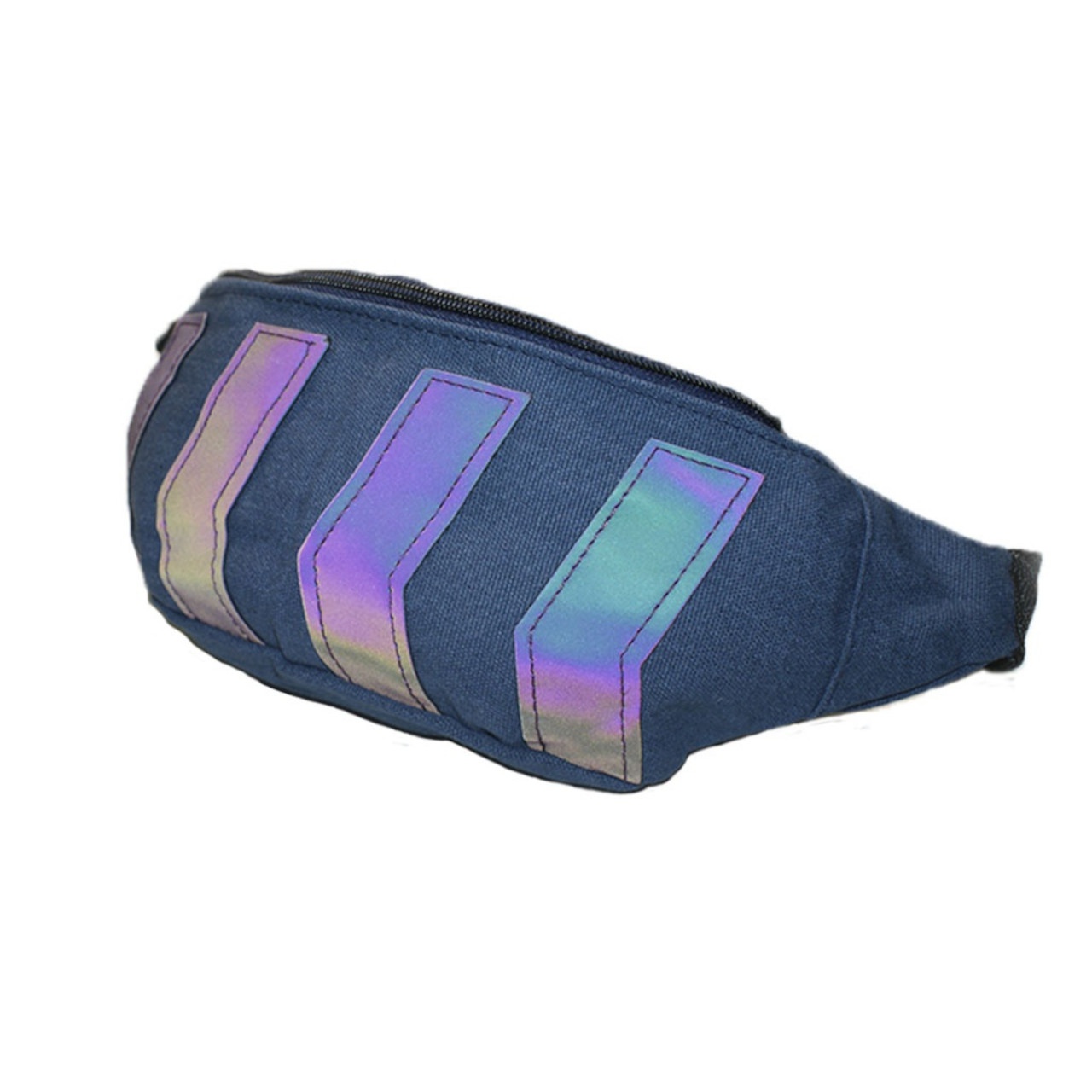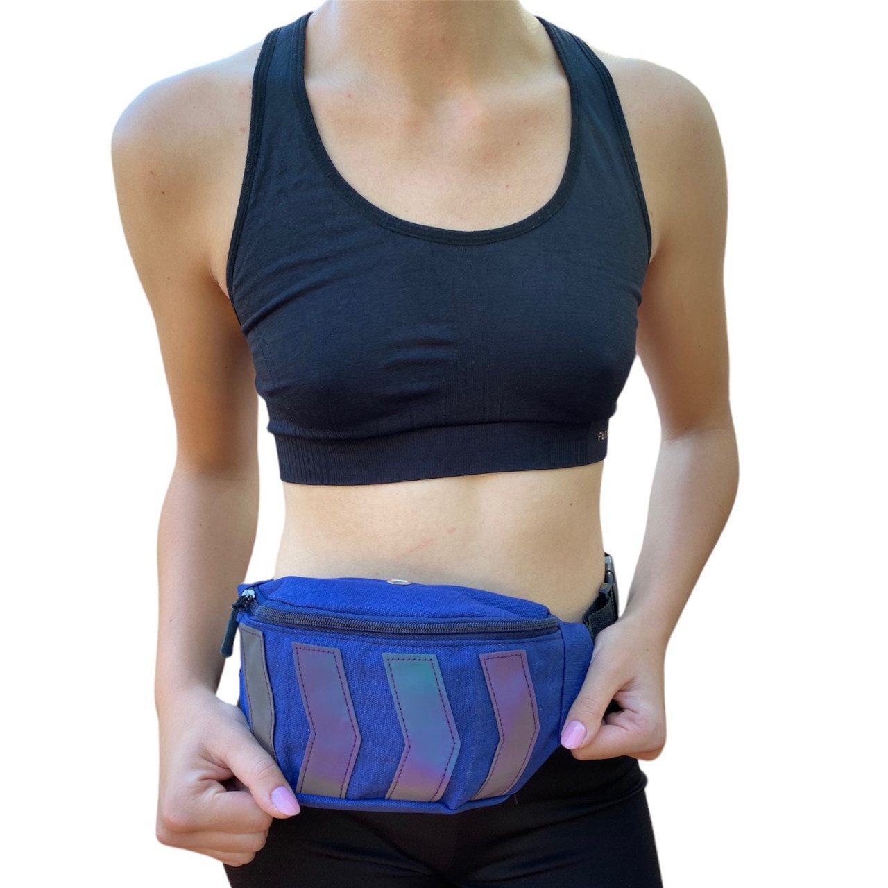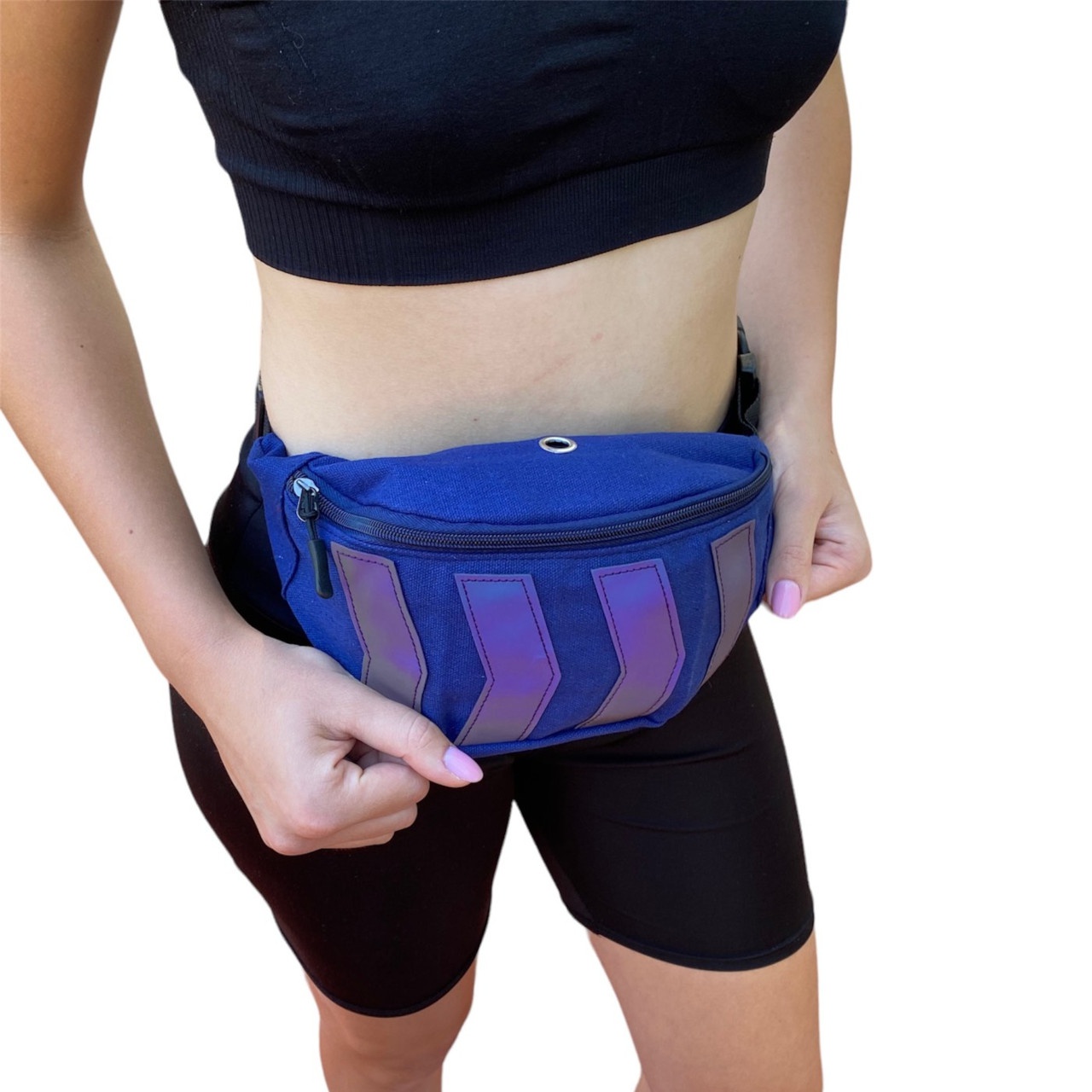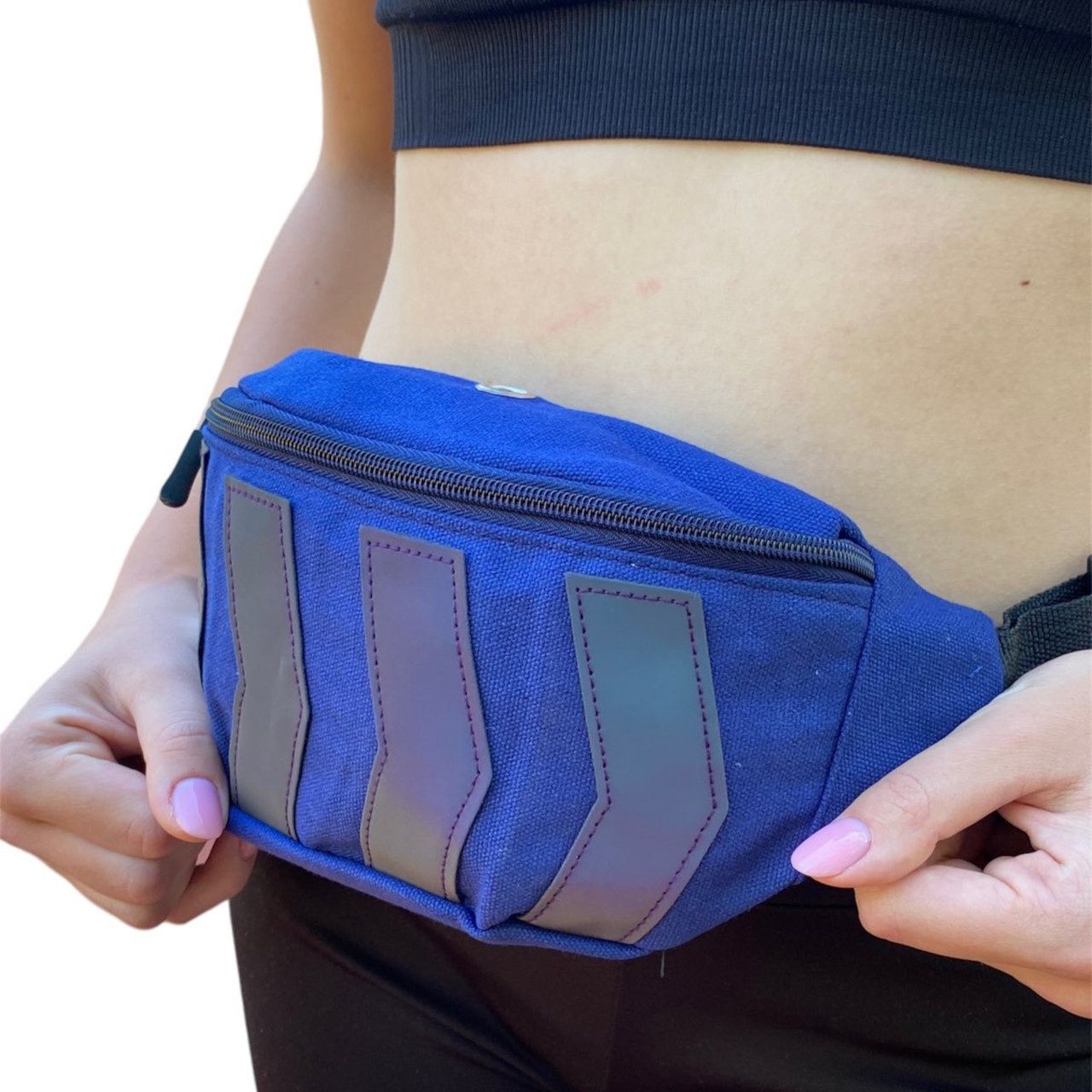 Сумка на пояс із джутової тканини та льону, зверху нанесені 4 світловідбиваючі смуги. Сумка має одне відділення, яке закривається на блискавку. Поясний ремінець, що регулюється, застібається за допомогою пластикового карабіну. На верхньому клапані сумочки є отвір для навушників.