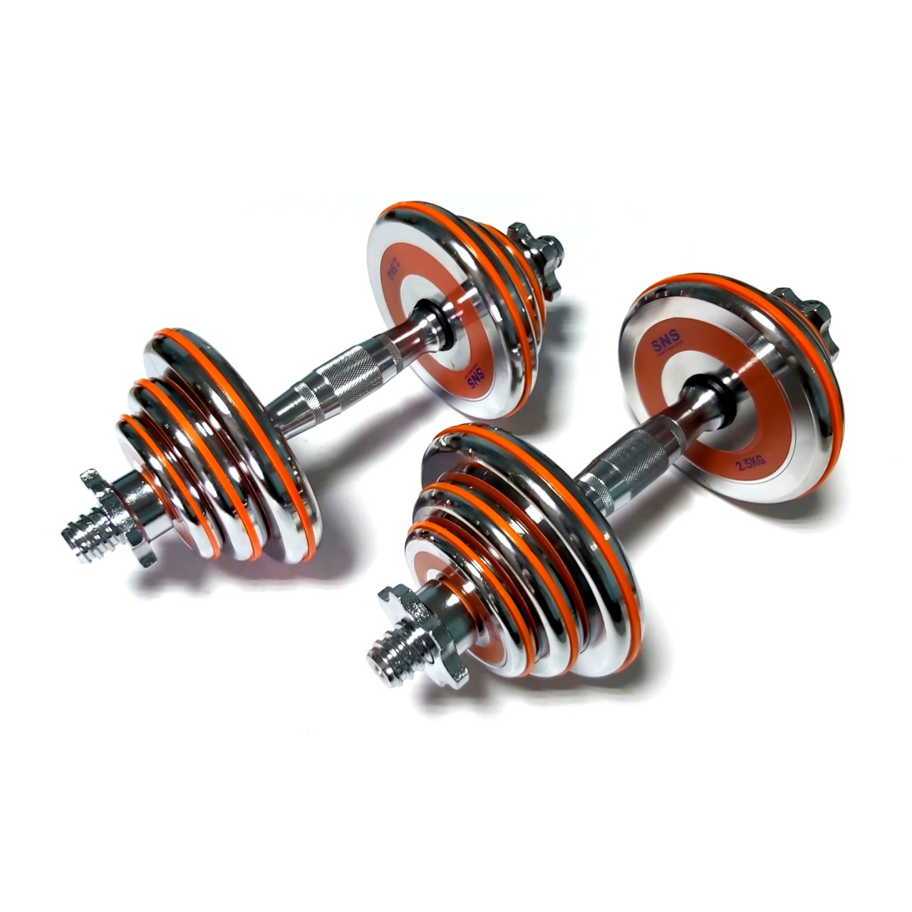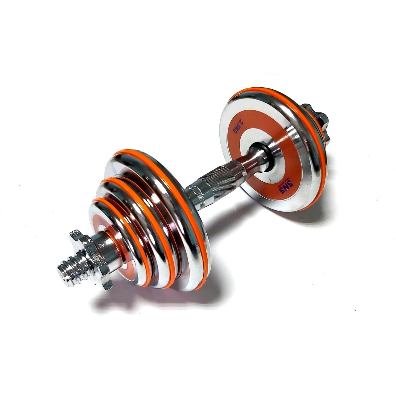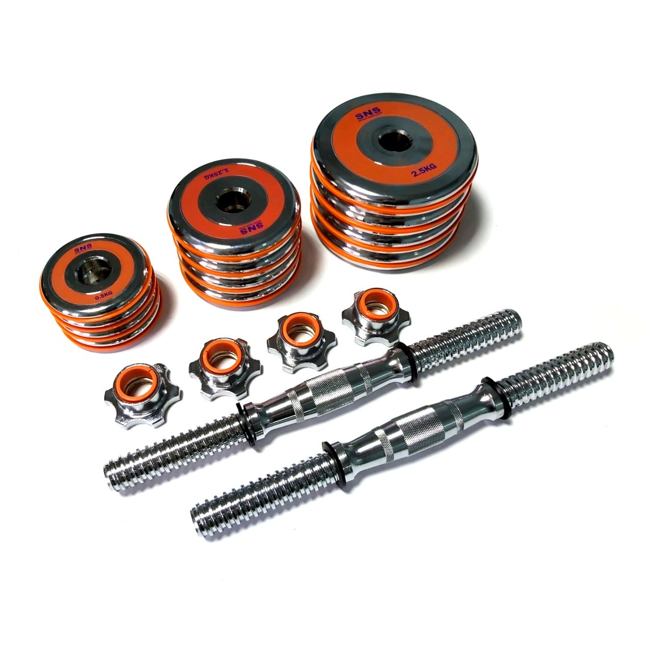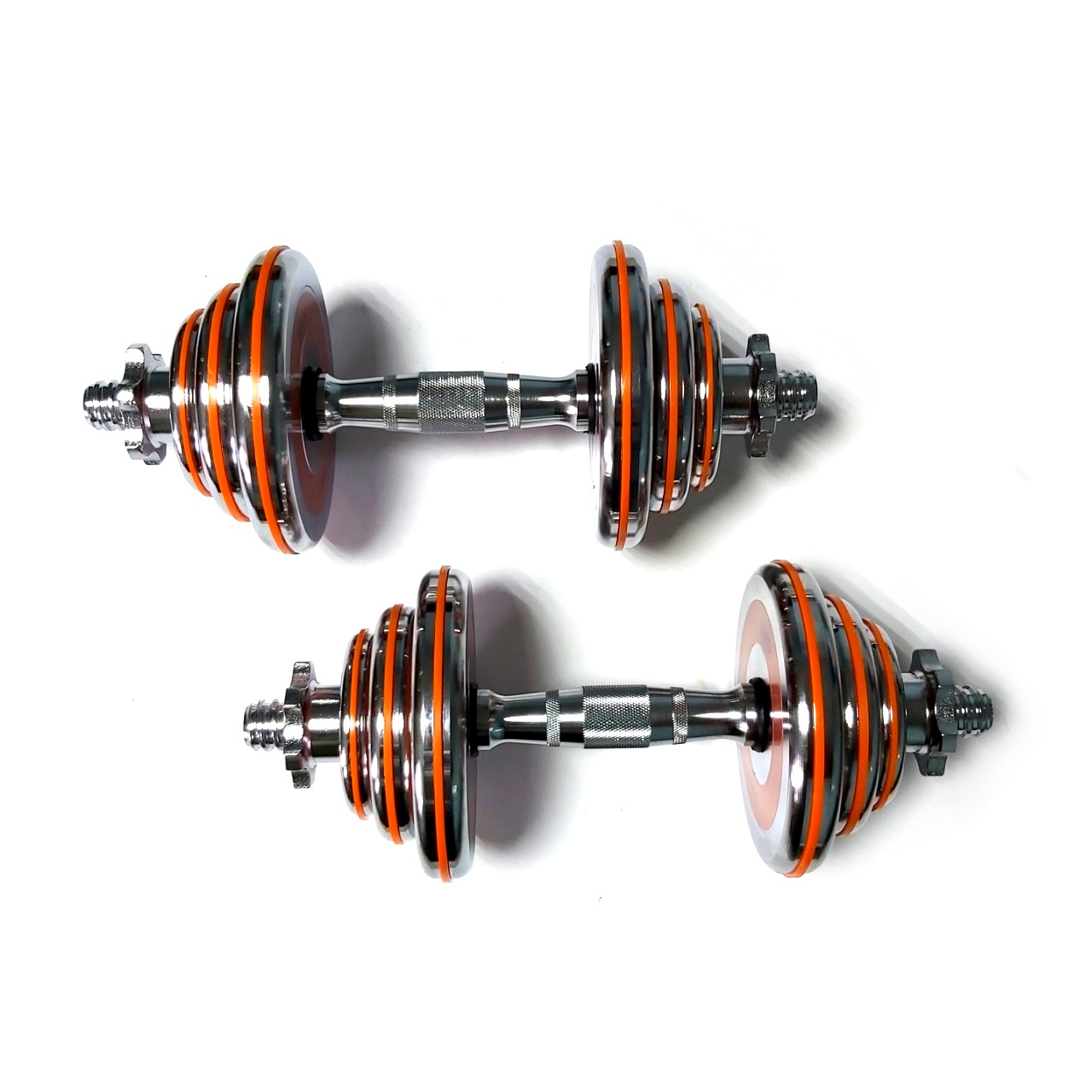 Гантелі розбірні виконані із хромованої сталі. Легка зміна дисків дозволить швидко підібрати оптимальну для себе вагу. Кожен диск доданий оранжевим демфером. Гантелі набір із двох штук допоможуть дзеркально опрацювати м’язи, вони зручні у використанні. Гантелі мають гриф із насічками, що забезпечує більше зчеплення з долонями.