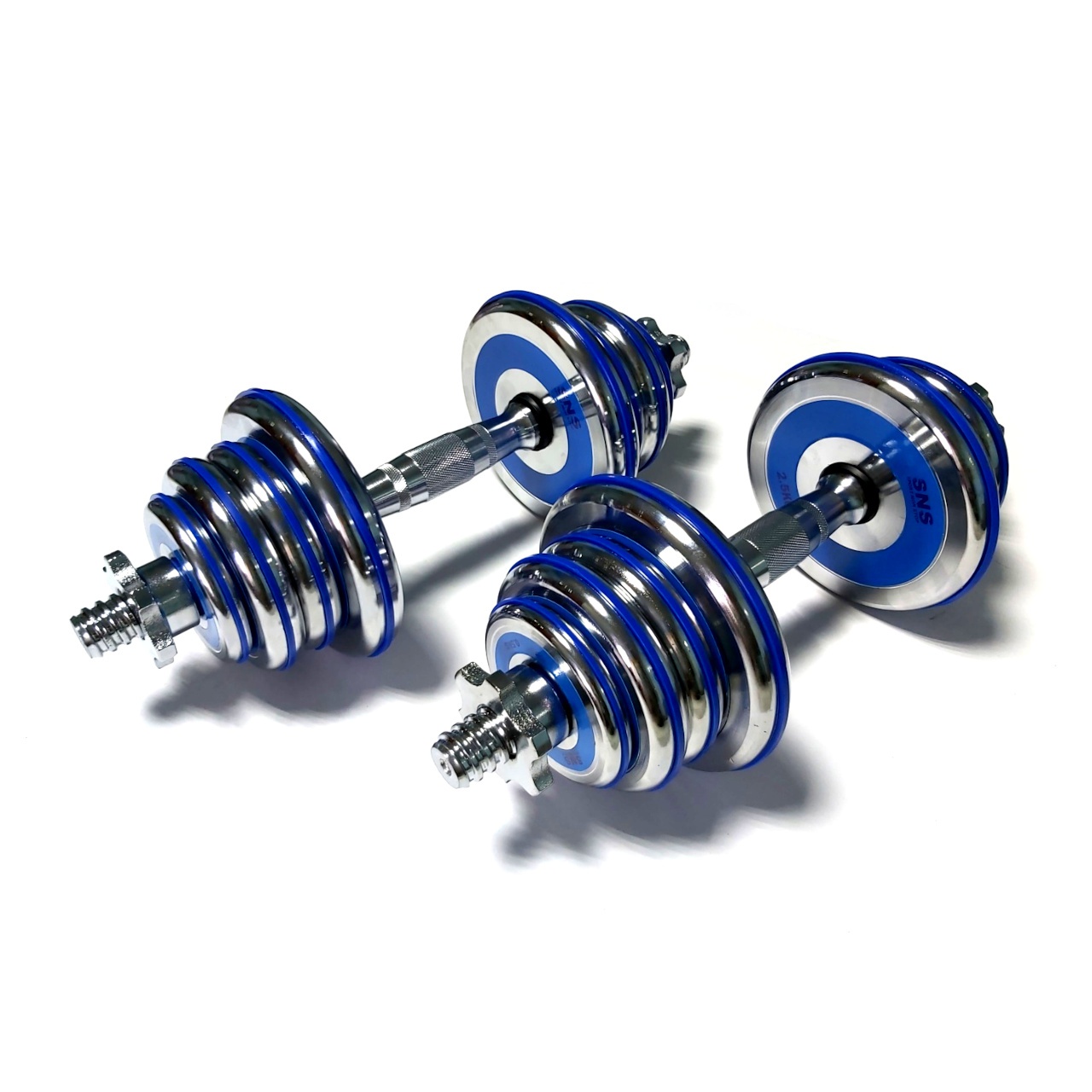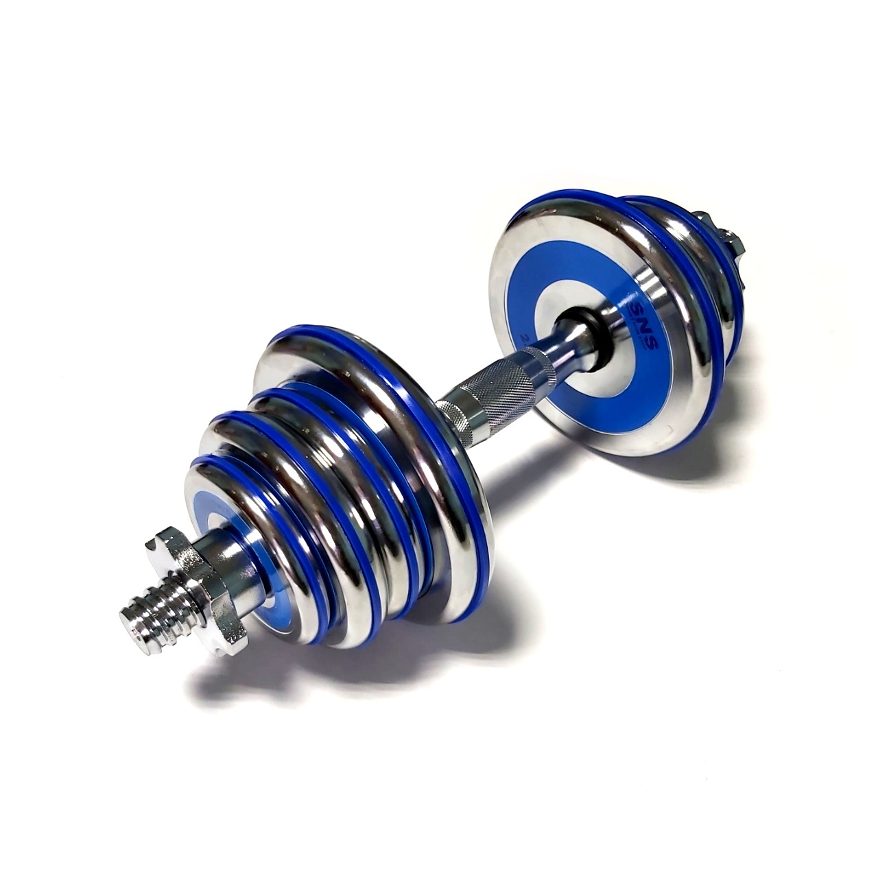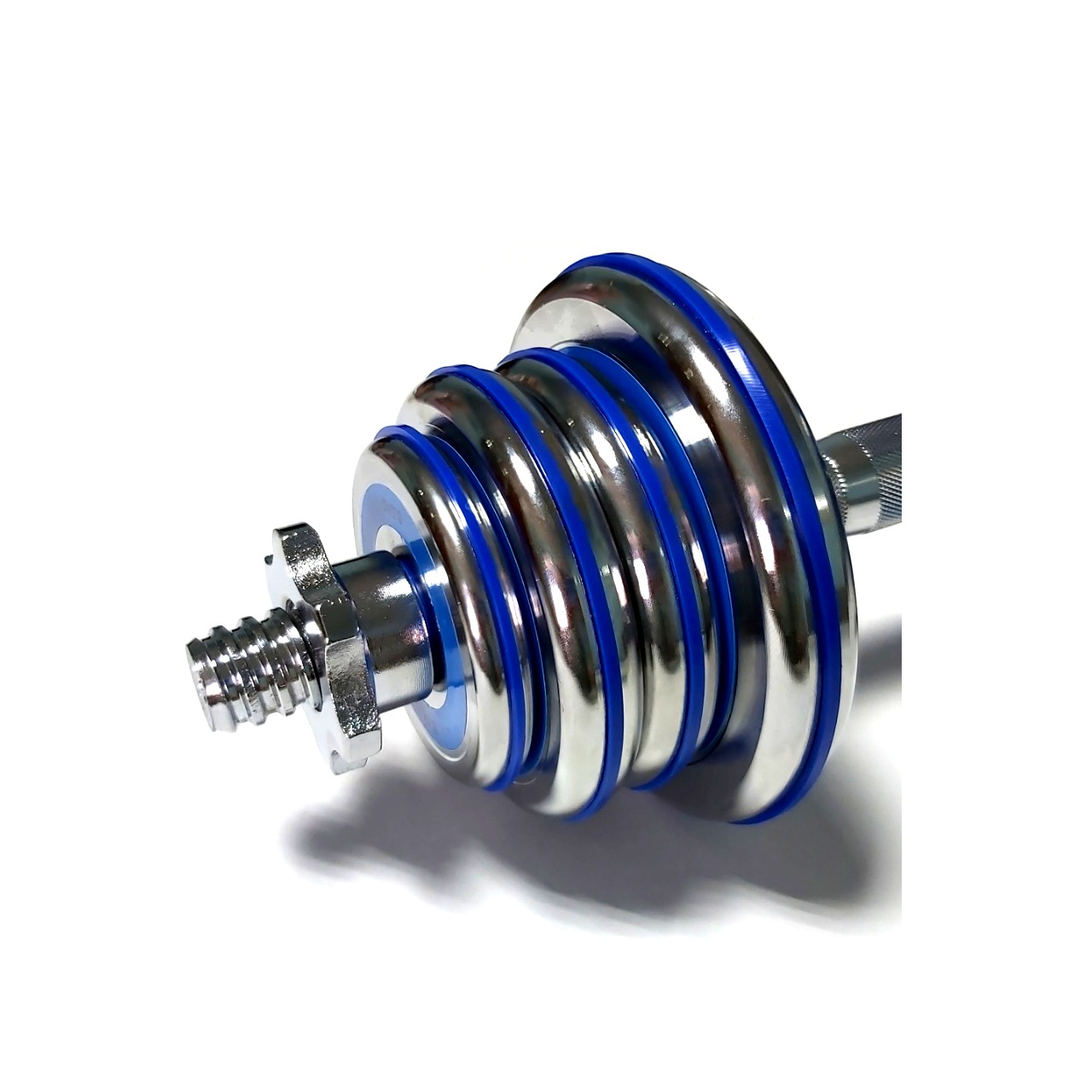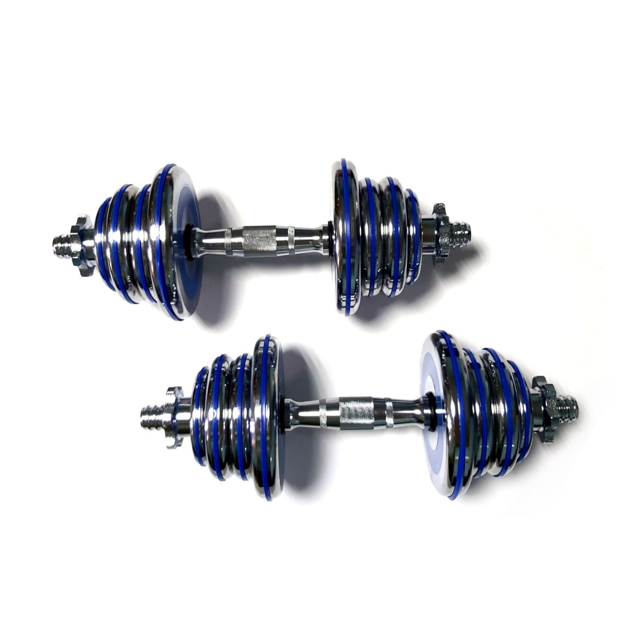 Гантелі розбірні виконані із хромованої сталі. Легка зміна дисків дозволить швидко підібрати оптимальну для себе вагу. Кожен диск доданий блакитним демфером. Гантелі набір із двох штук допоможуть дзеркально опрацювати м’язи, вони зручні у використанні. Гантелі мають гриф із насічками, що забезпечує більше зчеплення з долонями.