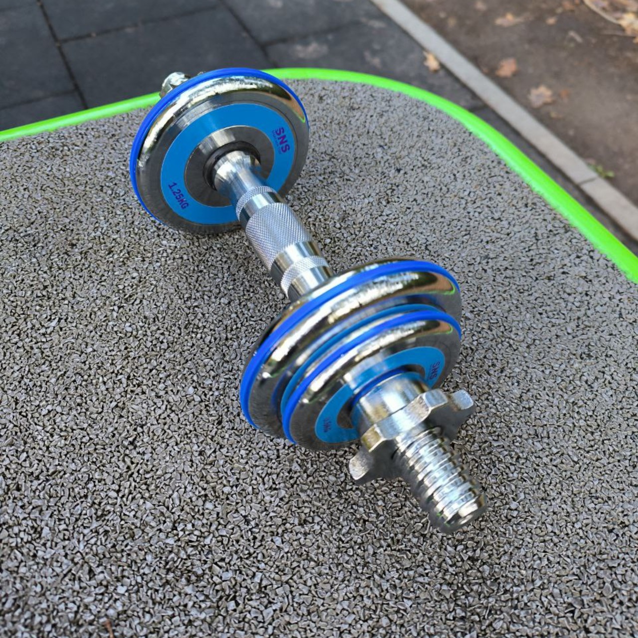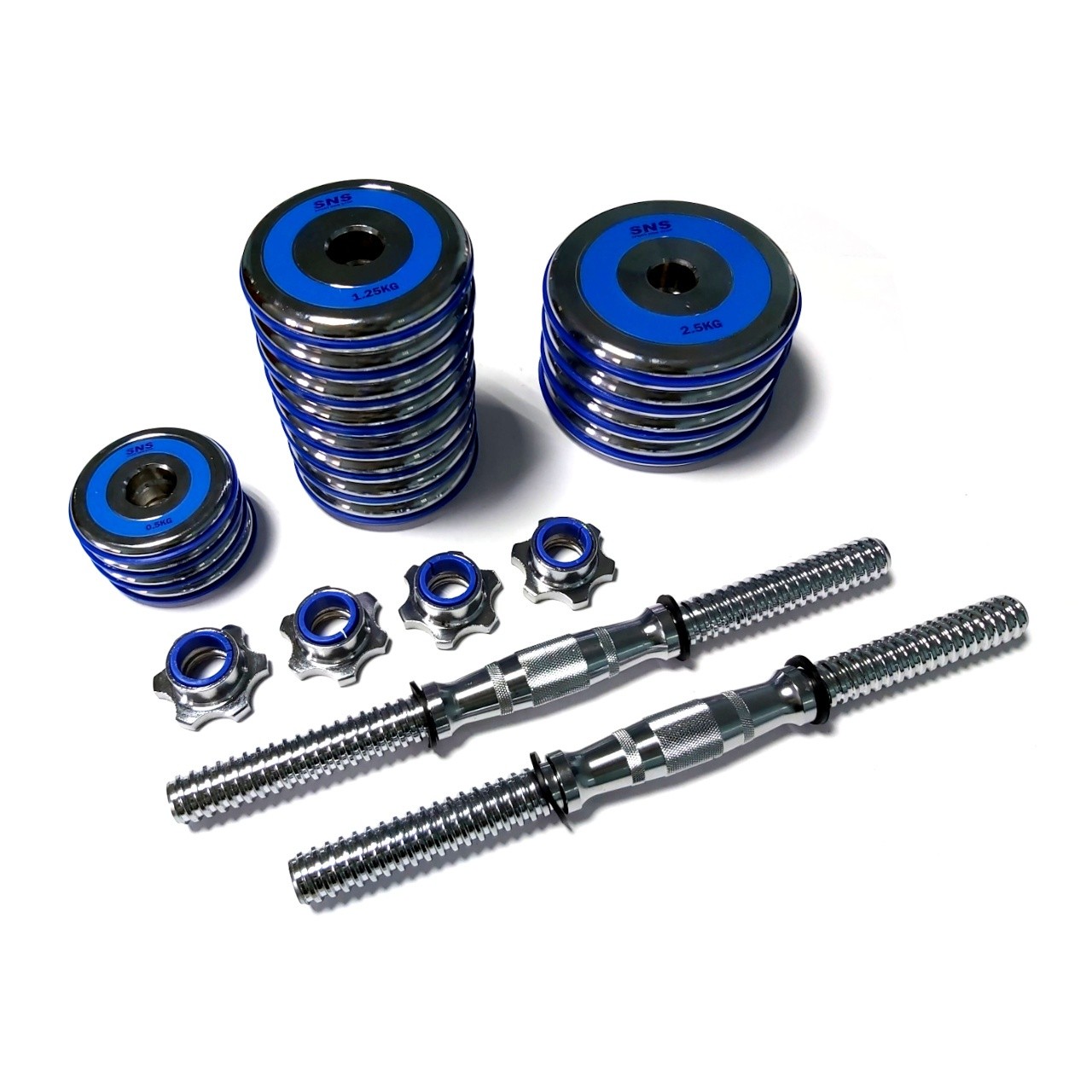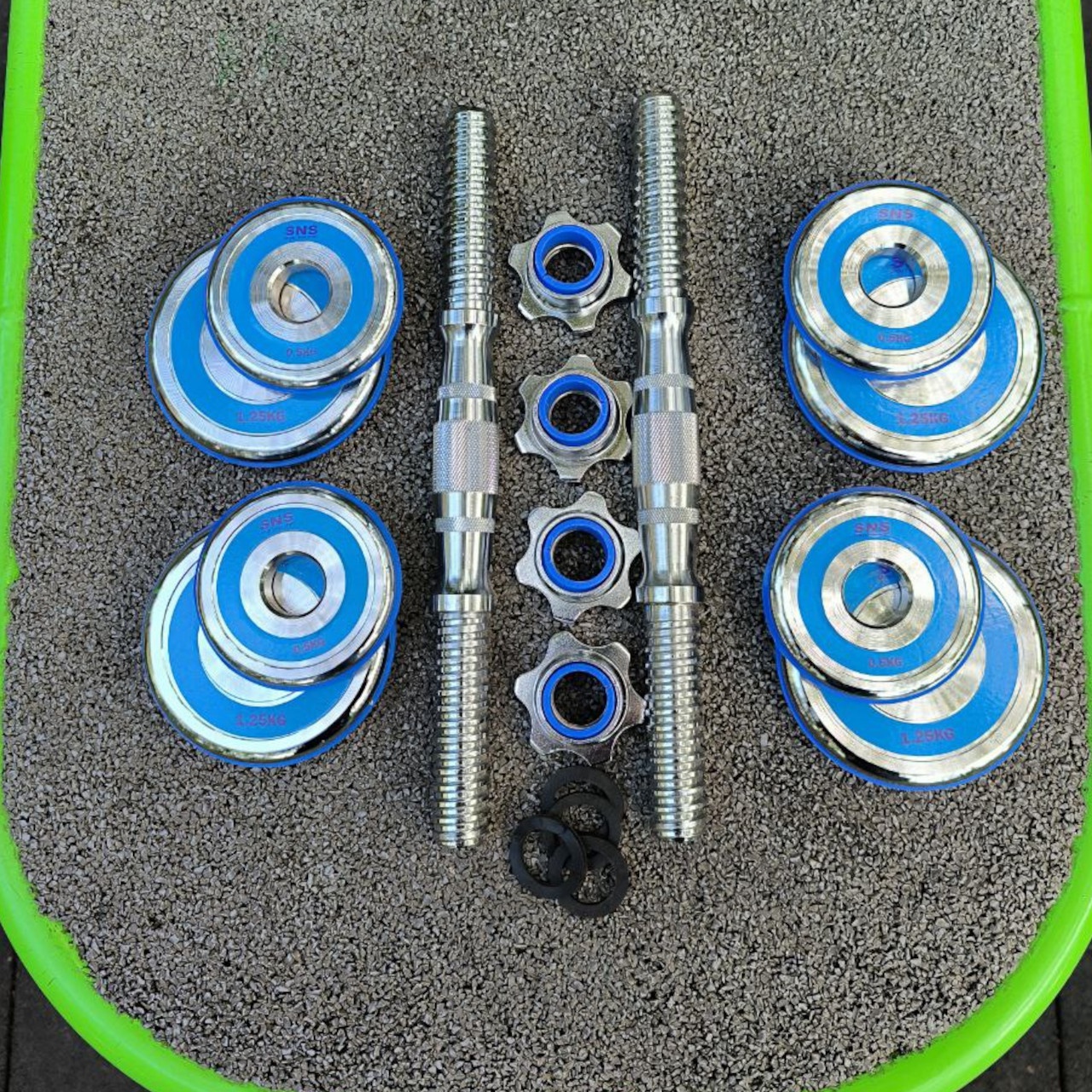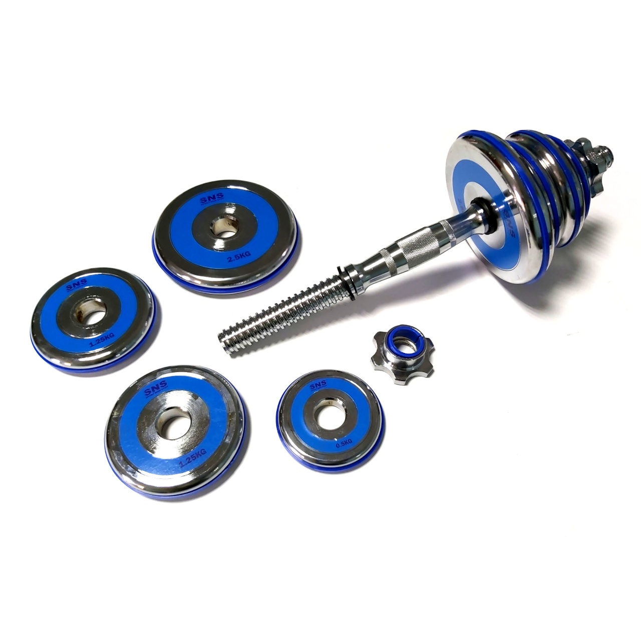 Гантелі розбірні виконані із хромованої сталі. Легка зміна дисків дозволить швидко підібрати оптимальну для себе вагу. Кожен диск доданий блакитним демфером. Гантелі набір із двох штук допоможуть дзеркально опрацювати м’язи, вони зручні у використанні. Гантелі мають гриф із насічками, що забезпечує більше зчеплення з долонями.